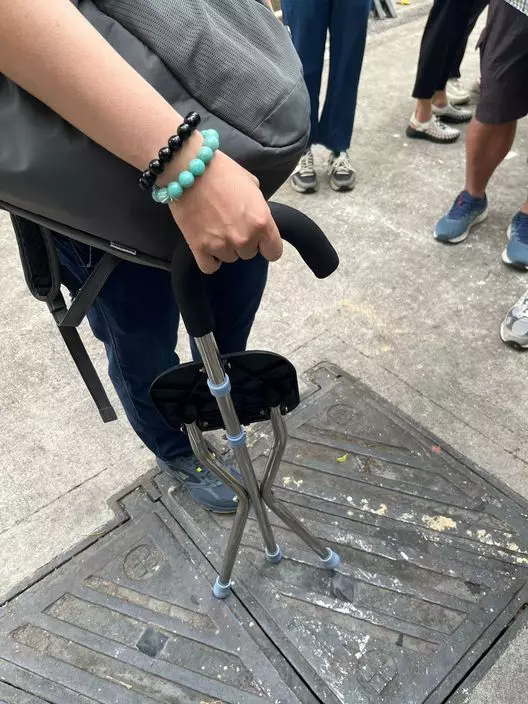 宏新閣住戶吳先生為七旬父親買了一張可摺式拐杖櫈,讓爸爸上樓時邊走邊休息。巴士的報記者攝