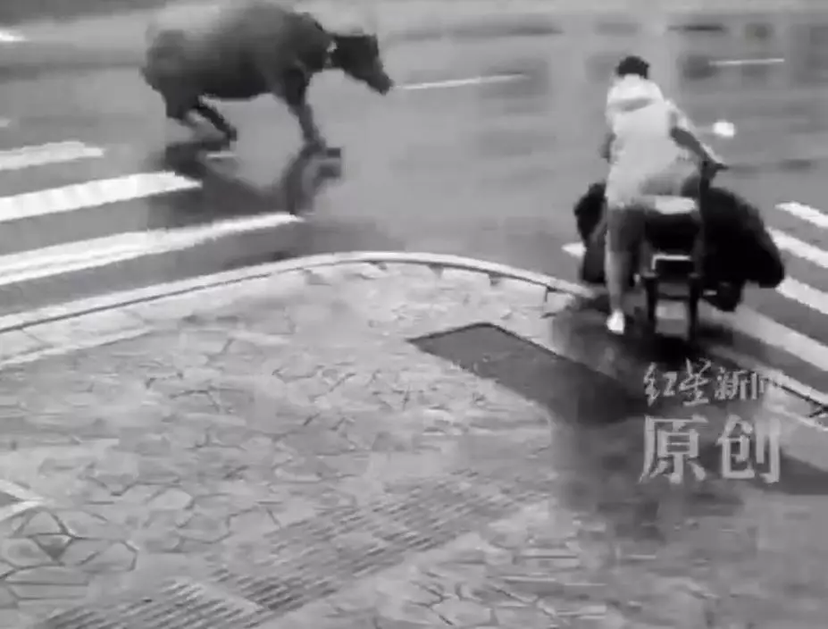 畫面可見,該頭水牛突然在馬路上高速奔跑,期間更一度「滑鏟」式衝向一名騎乘電單車的男子。男子見狀即時棄車逃生,水牛隨即以牛角猛力撞向電單車,場面相當驚險。之後水牛未有停下,轉而衝向其他目標,現場極為混亂。