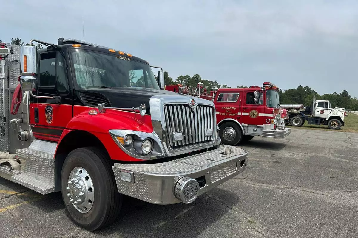 2026年4月22日周三,消防車停泊在佐治亞州納亨塔的指揮中心外,官員們正在協調撲救山火。(美聯社圖片/Russ Bynum) AP圖片