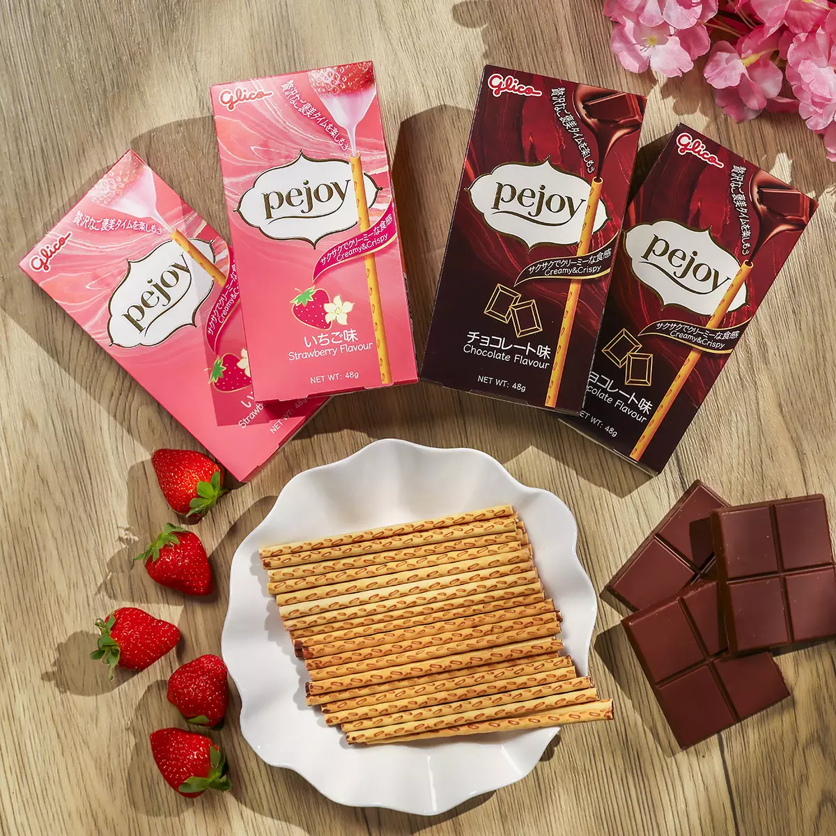 「pejoy 朱古力味夾心餅乾條」帶來濃郁香醇的可可風味,嚴選優質可可粉製成絲滑微苦而不甜膩的朱古力夾心,外層餅乾酥脆輕盈,雙重口感完美融合,保證一試難忘!而「pejoy 士多啤梨味夾心餅乾條」,融入清新香甜的的士多啤梨風味醬,令人不禁一口接一口,越食越想食。