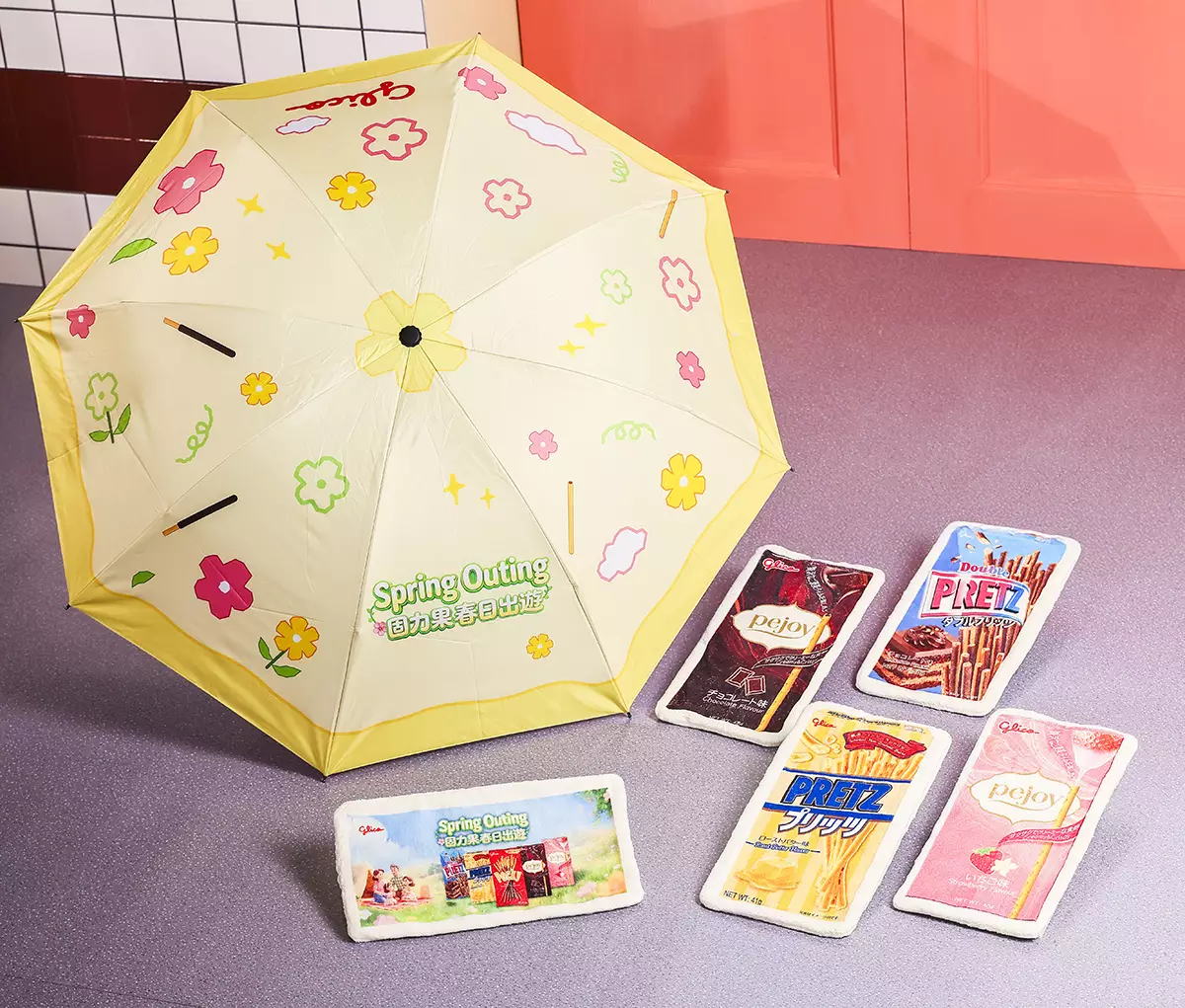 固力果造型擦手巾、輕便防曬雨傘及大派2,000盒pejoy夾心餅乾條