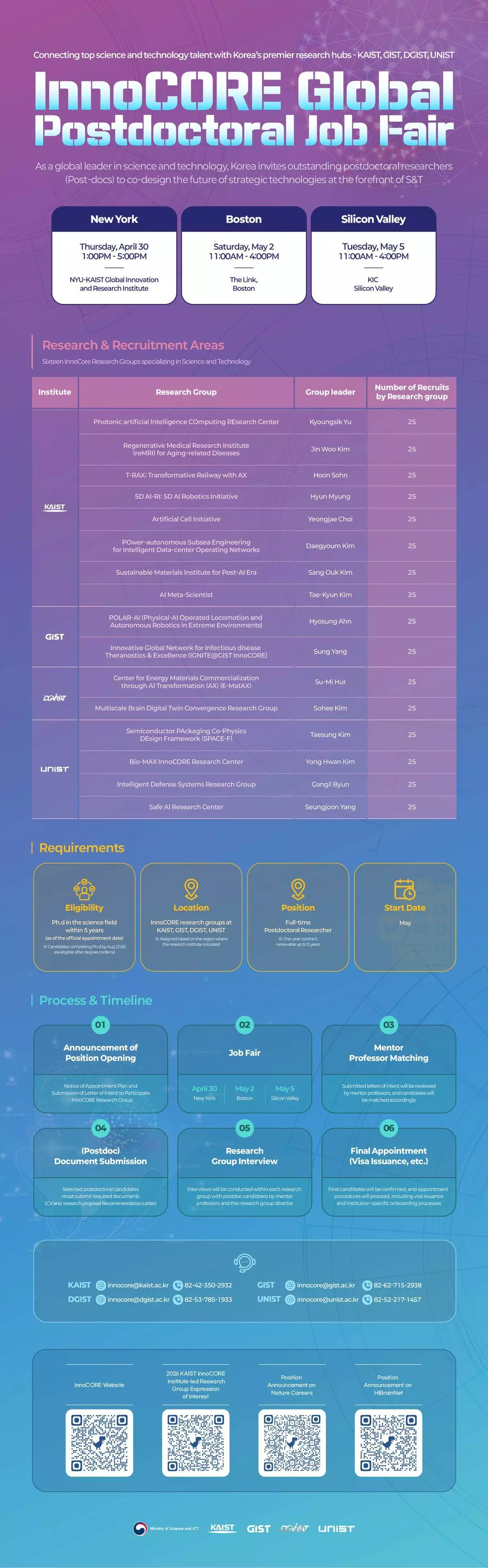 2026年的招聘會將在美國三個主要創新中心舉行。每場活動將包括InnoCORE計劃簡報、研究集群介紹,以及與韓國研究組組長進行的現場面試。