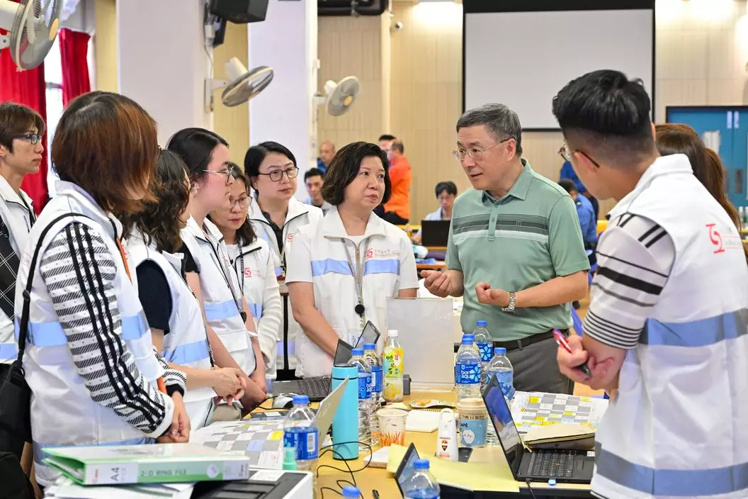 卓永興先與在場的民安隊及社署人員見面交流,隨後前往聯合指揮中心了解最新情況。其後,他轉到大埔浸信會公立學校內設立的住户等候區,與正在等候上樓的宏道閣居民交談,了解他們的狀況與需要。