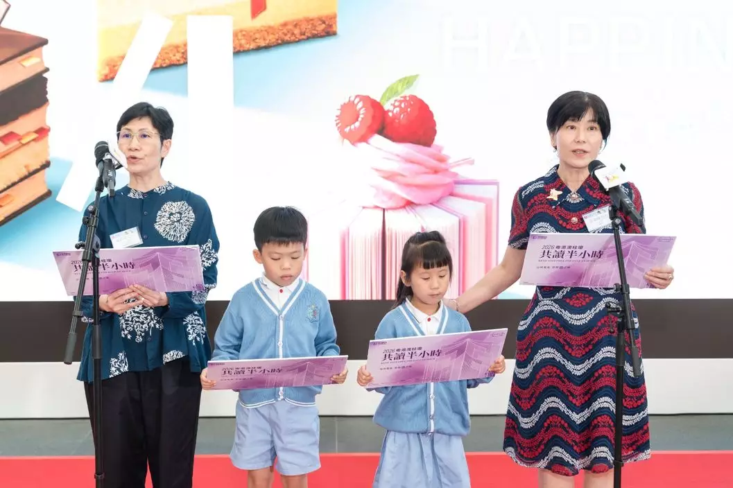 安徒生會總幹事黃美坤(右一)、香港公共圖書館總館長(管理)1謝嘉儀(左一)帶領小朋友宣讀「共讀宣言」。