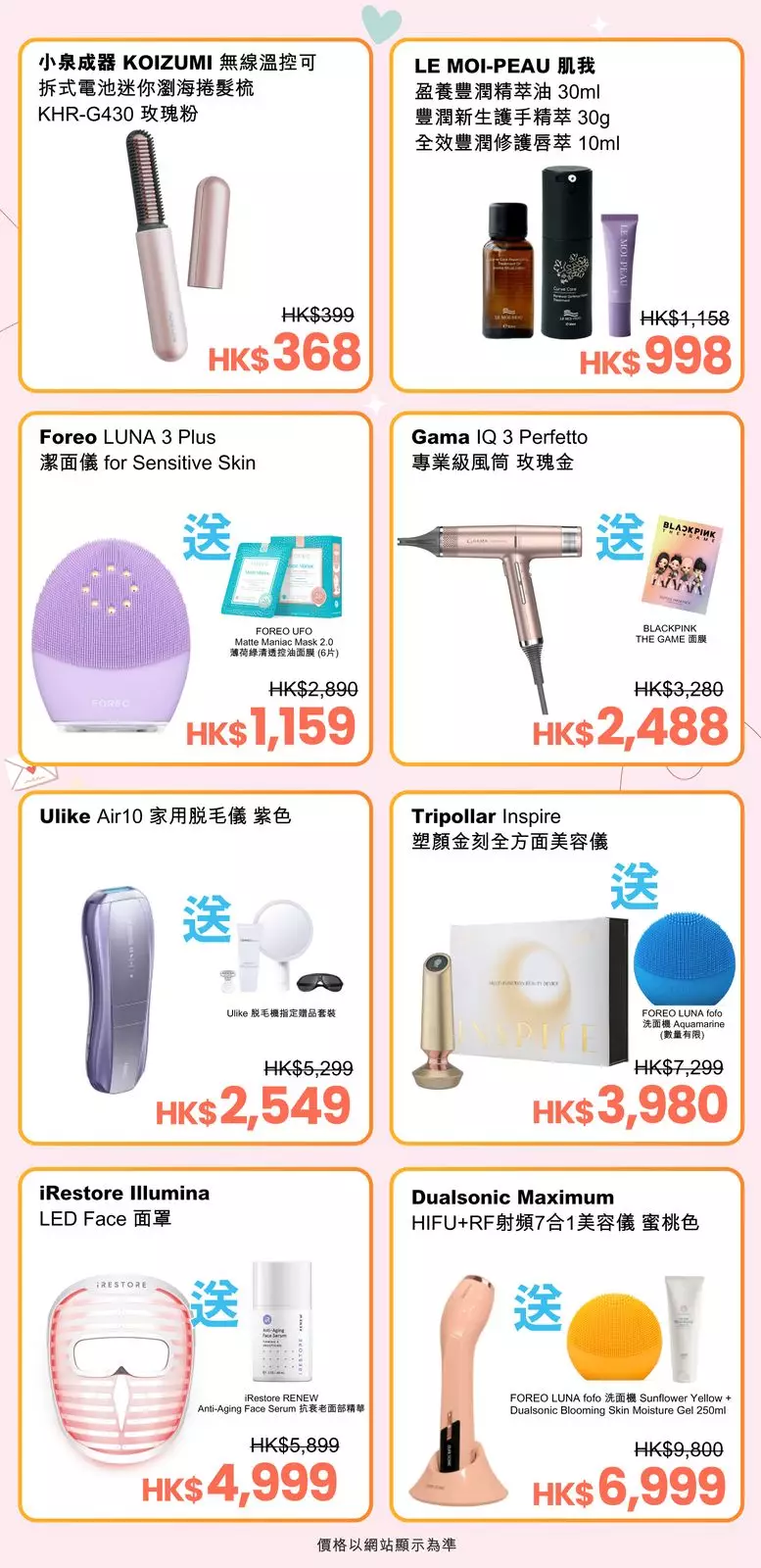 最後是「8大精選母親節優惠套裝低至4折」。J SELECT Beauty為是次活動準備了多款美容儀、護膚品、脱毛機及風筒等組合,例如購買人氣Tripollar或Dualsonic美容儀,會附送FOREO LUNA fofo洗面機;亦有港人創辦的Clean Beauty品牌LE MOI PEAU肌我套裝等,讓顧客以折扣價選購合心意的母親節禮物。