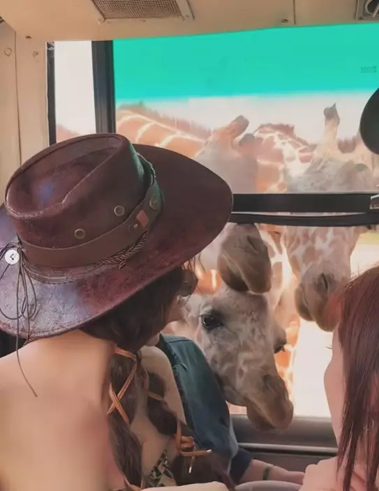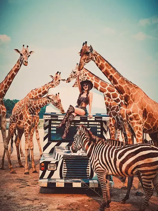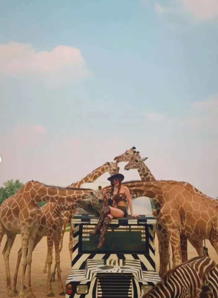 除了與「萬獸之王」互動,Rain亦乘坐動物園標誌性的斑馬紋吉普車。她在車頂大晒招牌長腿,身邊則圍繞著多隻長頸鹿和斑馬。面對長頸鹿爭相搶奪手中的飼料,Rain表現得從容不迫,更顯得玩得相當投入。