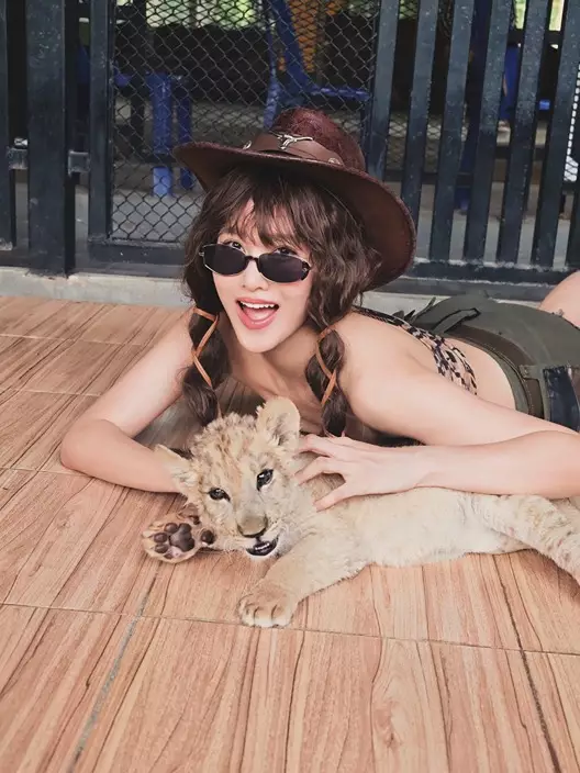 從Rain分享的照片中可見,她為配合動物園的主題,特別穿上虎紋Bra Top,露出白滑雙肩及豐滿身形。她頭戴牛仔帽、紮起活潑孖辮,下身則配搭軍綠色短褲及長靴,造型既有牛仔的率性又不失性感,完美融入野生環境。