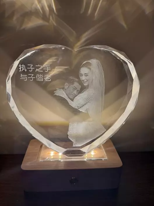 根據該商家透露,城城挑選了兩款水晶座。一款為心型款式,印有兩人的結婚照及刻上「執子之手,與子偕老」字句,更具備發光功能,售價僅為288元人民幣(約330港元);另一款方型水晶座則寫上「願歲月可回首,且以深情共白頭」,價值388元人民幣(約445港元)。據悉,兩件禮物合計折後僅需約600元人民幣(約688港元)。
