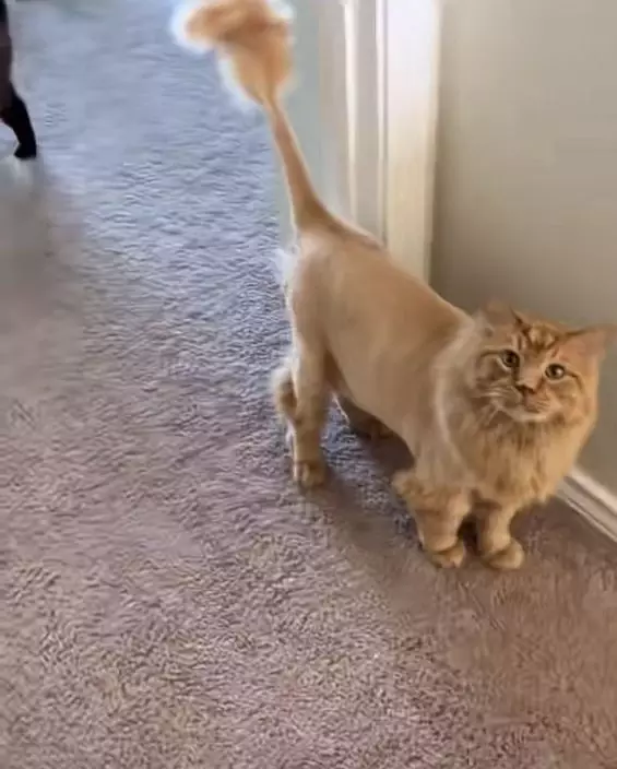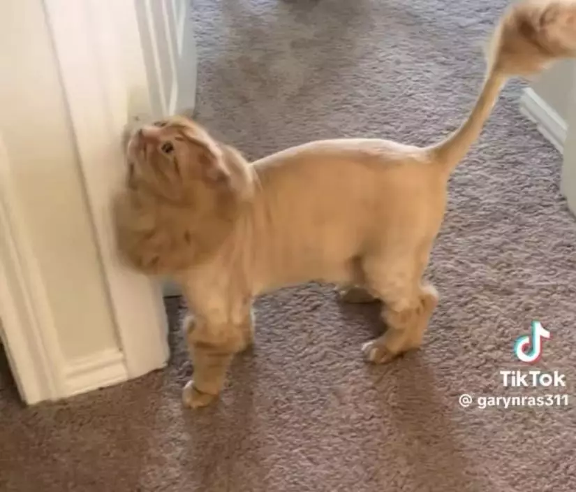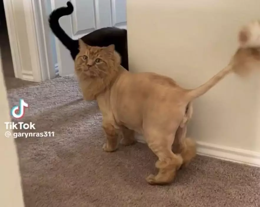 13歲長毛橘貓因季節轉換被帶去剃毛搖身變「霸氣小獅王」。TikTok圖片