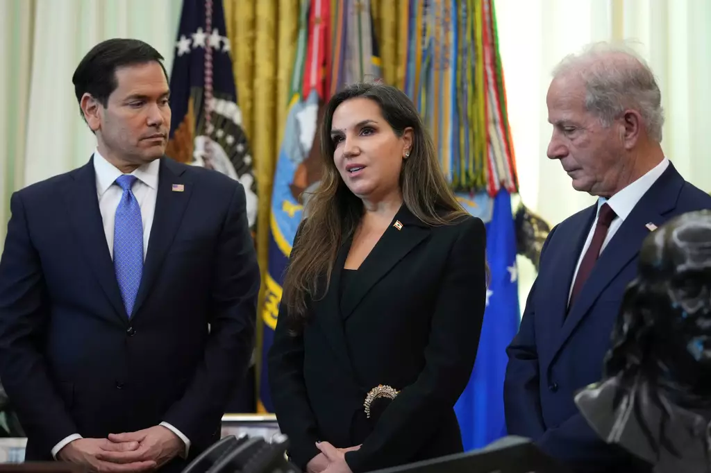 2026年4月23日星期四,在華盛頓白宮橢圓形辦公室舉行的以色列和黎巴嫩大使會晤中,美國國務卿盧比奧(左)聆聽黎巴嫩駐美國大使娜達·哈馬德·穆阿瓦德和美國駐黎巴嫩大使米歇爾·伊薩的發言。AP圖片