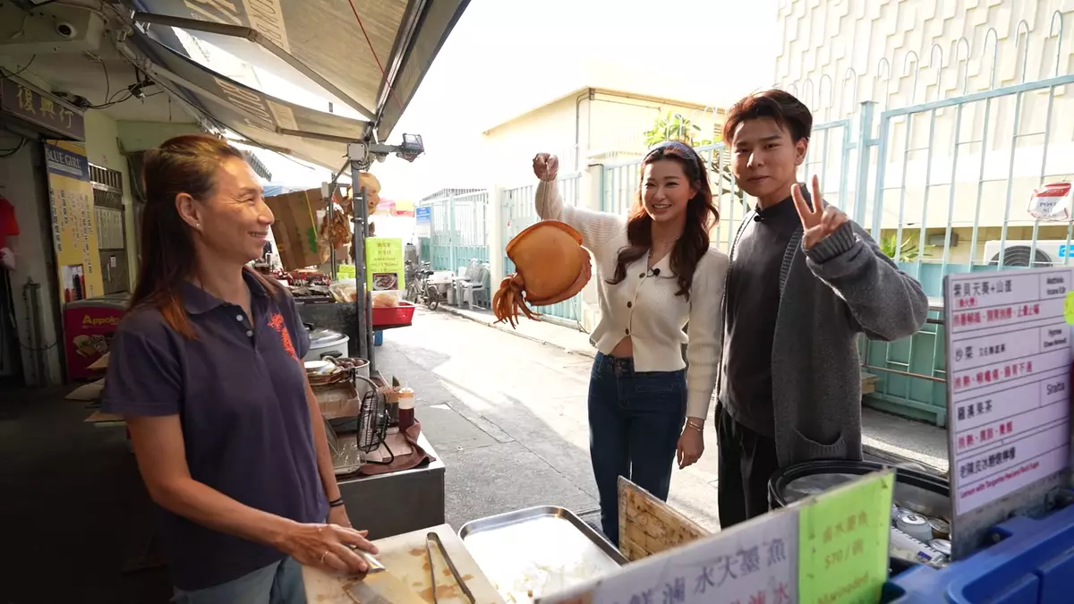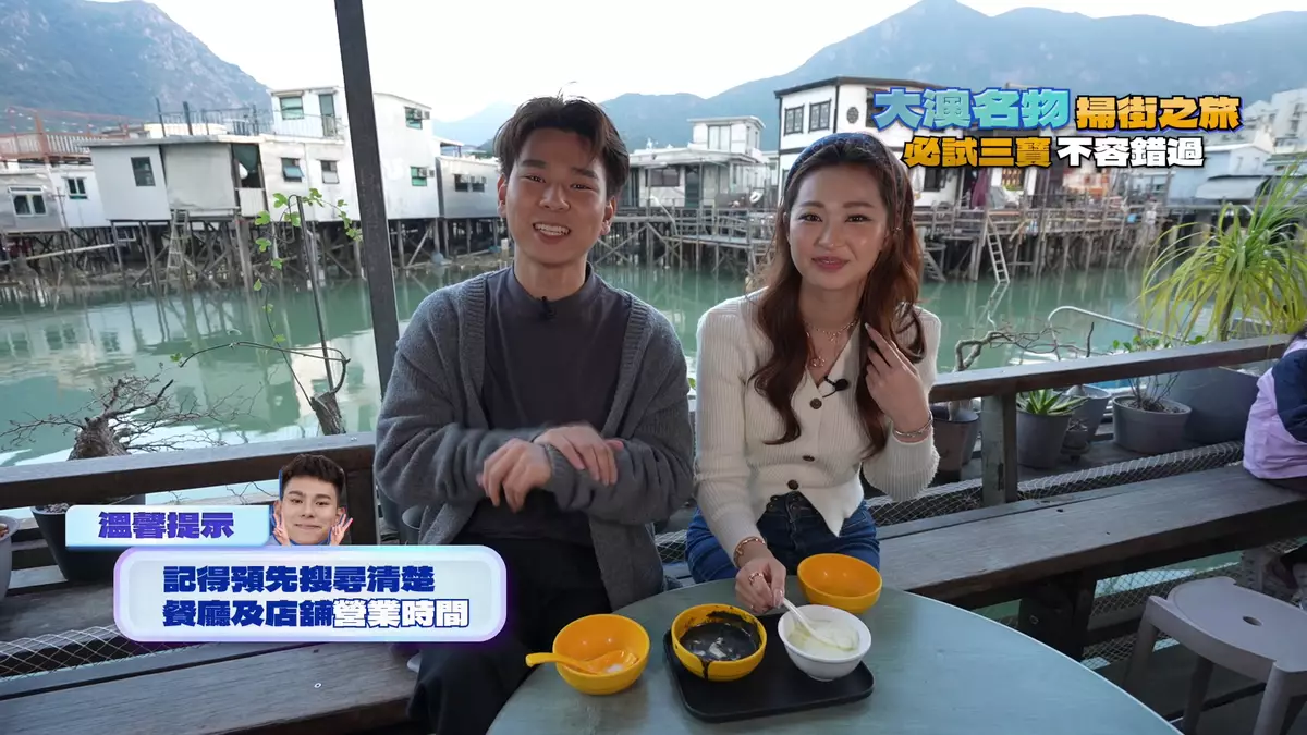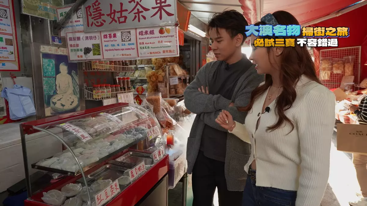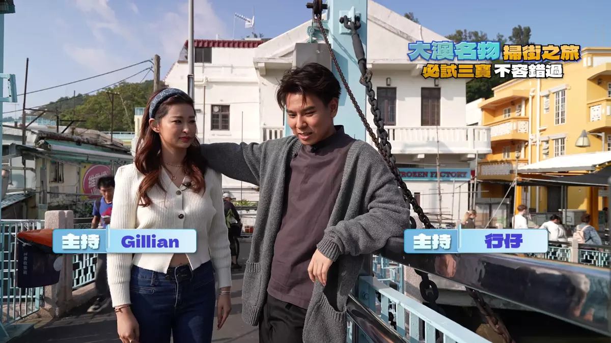 此外,蔡景行(行仔)與伍倩彤(Gillian)再到大澳掃街,當地有三大必食名物︰超大魚蛋、滷水大墨魚、芝麻糊溝豆腐花,都集中在永安街一帶。假如坐巴士來大澳,行不到2分鐘便會見到一檔魚蛋檔,該店賣的魚蛋及墨魚,可以用超大來形容,Gillian以魚蛋迷身份試食,她說︰「唔好睇佢顏色唔係好深,但食落係香辣。雖然咁大粒,但係質地爽彈,似潮州白魚蛋。大墨魚雖然大隻,但咬落係易咬軟糯又入味。」接住他們行去食第三寶之前,經過一間開業逾半世紀的茶棵店,製茶棵的女士年齡已達太嫲級數。二人點了清熱解毒的雞屎藤茶棵、鹹味眉豆花生茶棵。最後幫襯埋芝麻糊拼豆腐花的第三寶,這趟大澳掃街之旅圓滿結束。