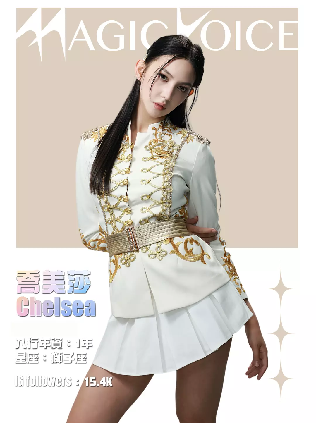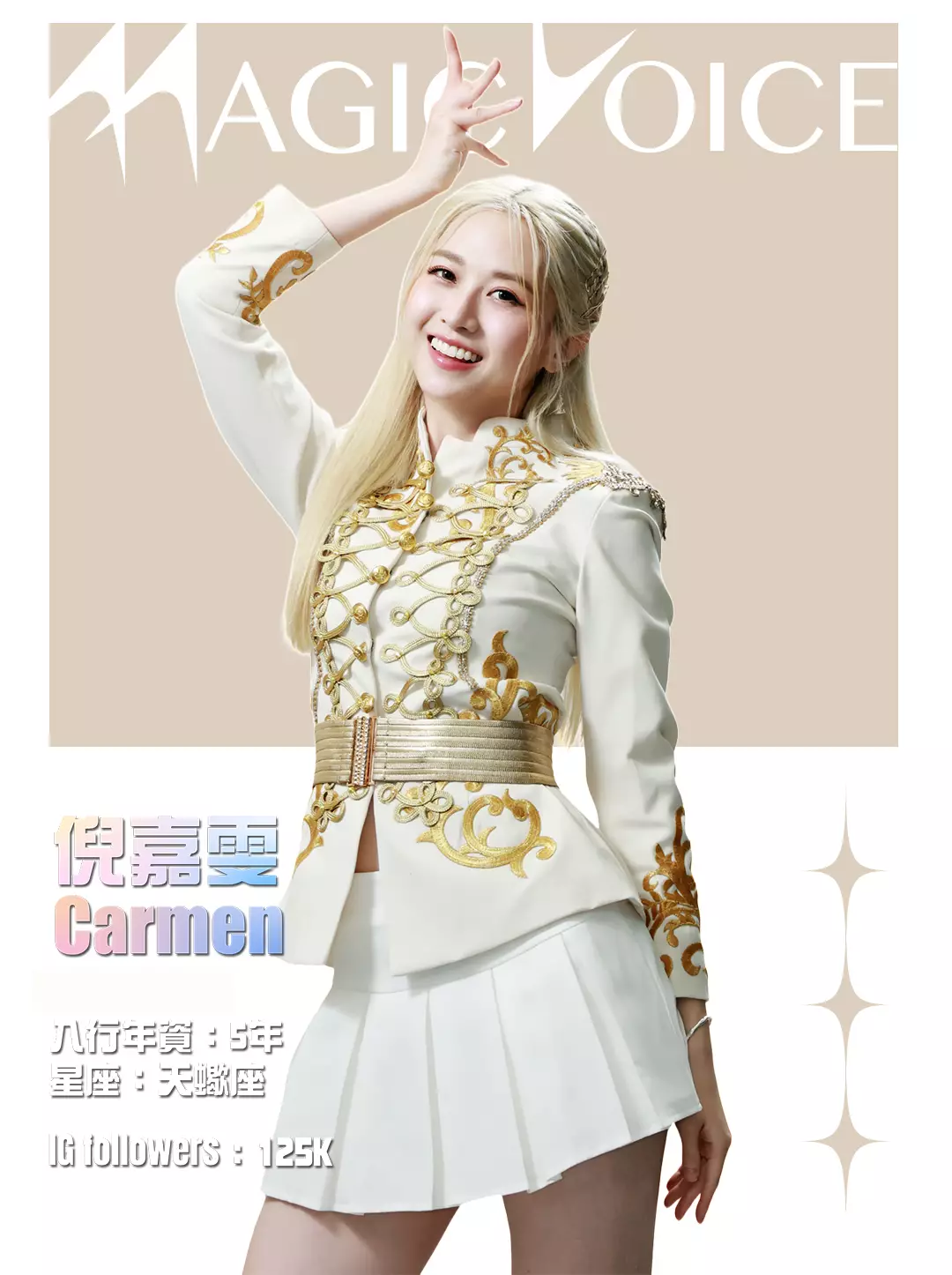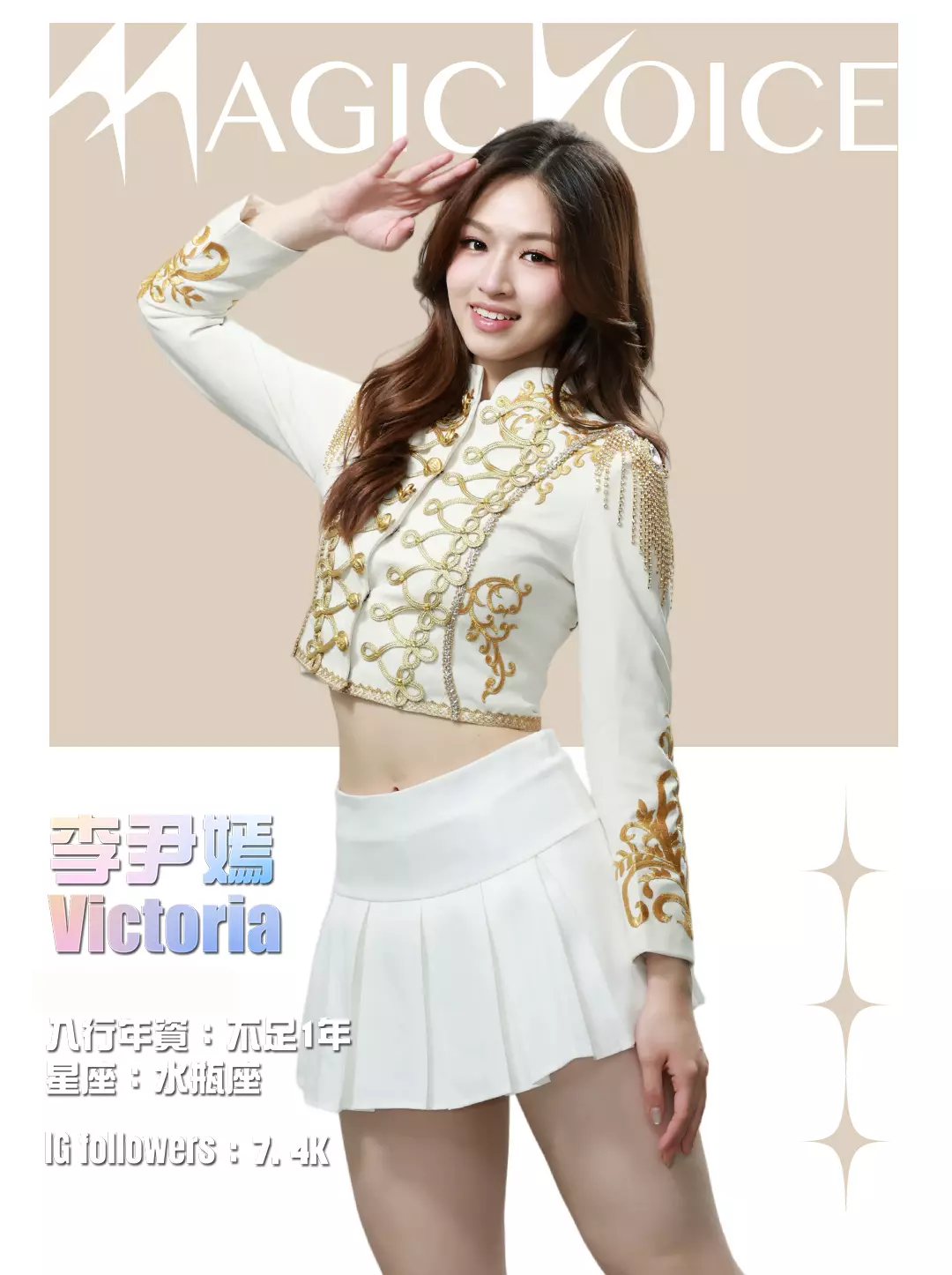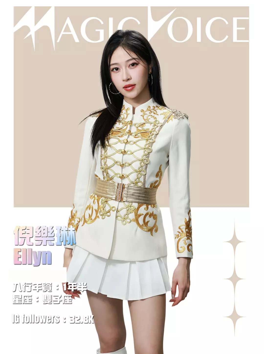 為了預熱,tvb.com昨晚(4月23日)及今早(4月24日)先後發布了16位練習生穿著白底金刺繡女團服、大晒長腿及纖腰的全新個人資料相,除了中、英文名字,還有各人入行年資、星座及IG Followers人數。16人之中,IG擁有最多Followers的頭3位練習生順序為倪嘉雯、廖慧儀及莊子璇。造型方面,除了倪嘉雯的金髮、葉靖儀及俞可程的紅髮夠搶鏡,唯一有戴后冠的莊子璇更是搶中之搶。