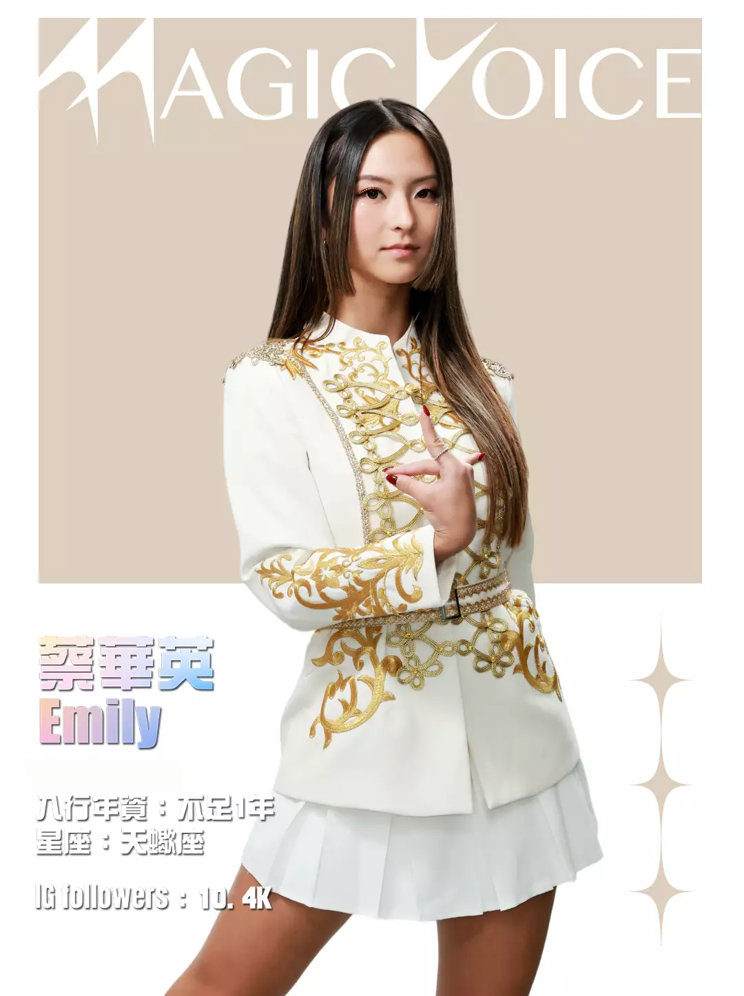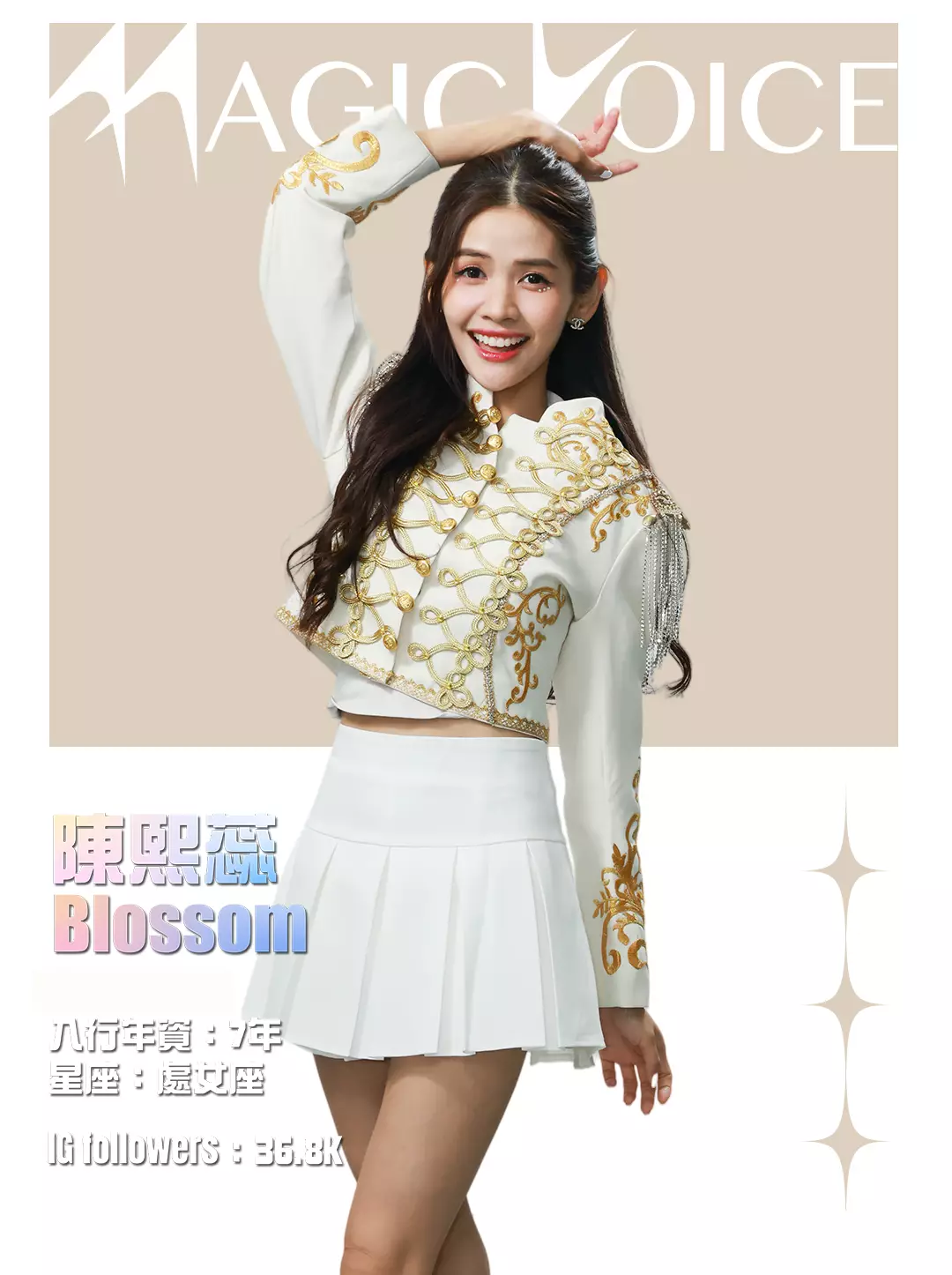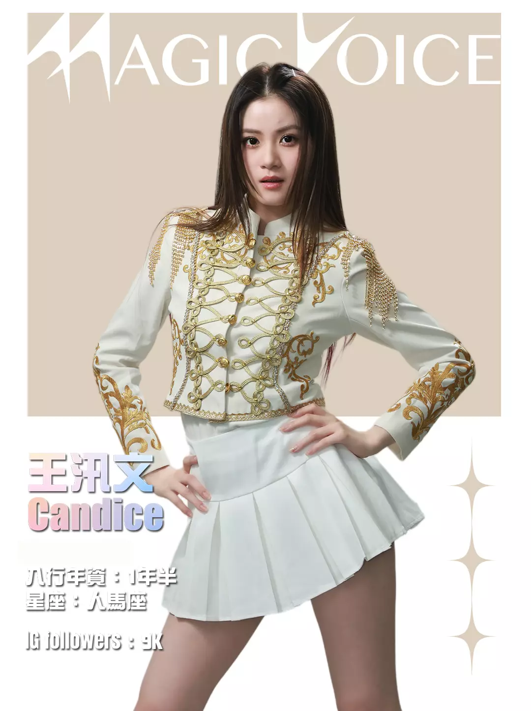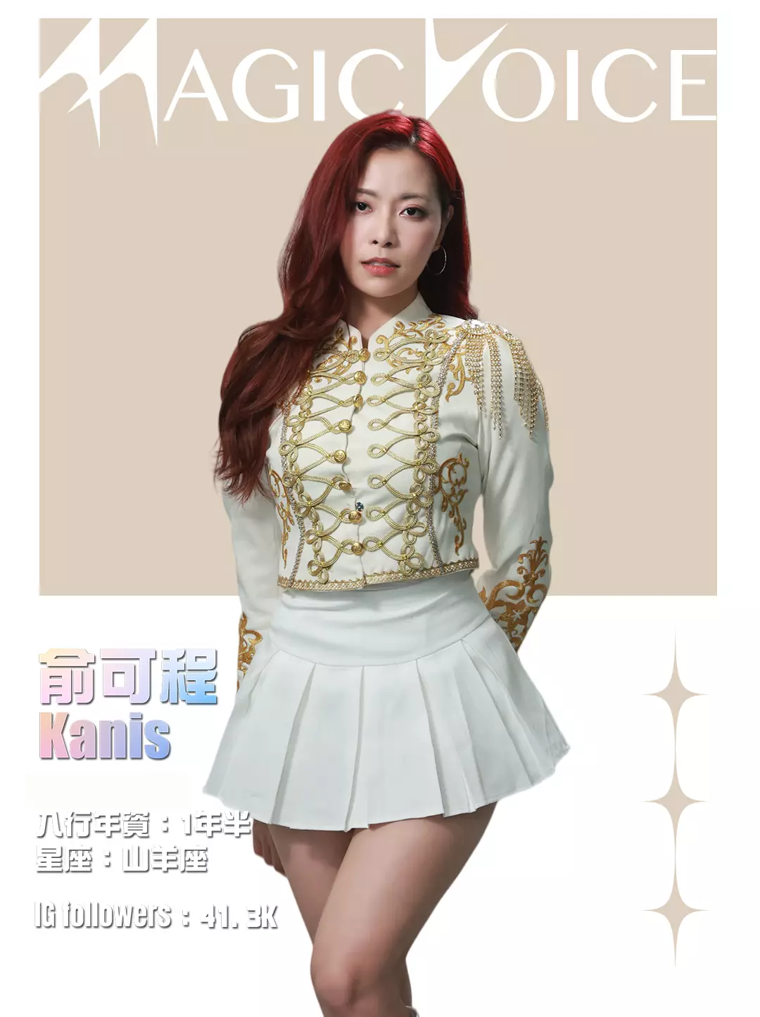 為了預熱,tvb.com昨晚(4月23日)及今早(4月24日)先後發布了16位練習生穿著白底金刺繡女團服、大晒長腿及纖腰的全新個人資料相,除了中、英文名字,還有各人入行年資、星座及IG Followers人數。16人之中,IG擁有最多Followers的頭3位練習生順序為倪嘉雯、廖慧儀及莊子璇。造型方面,除了倪嘉雯的金髮、葉靖儀及俞可程的紅髮夠搶鏡,唯一有戴后冠的莊子璇更是搶中之搶。
