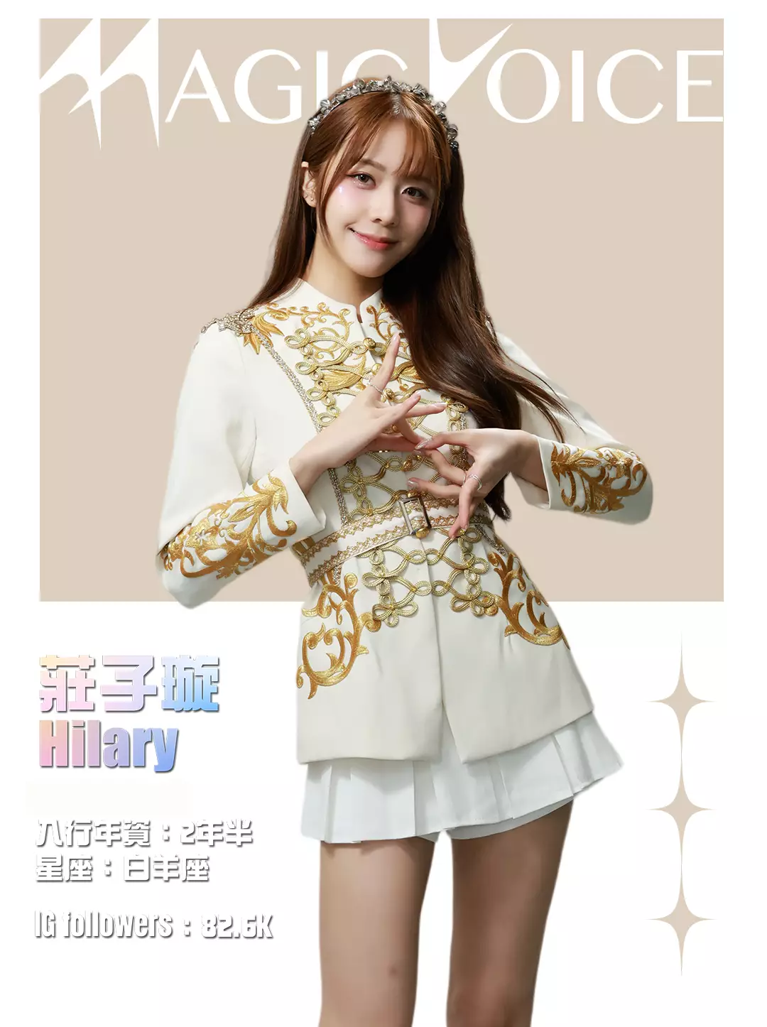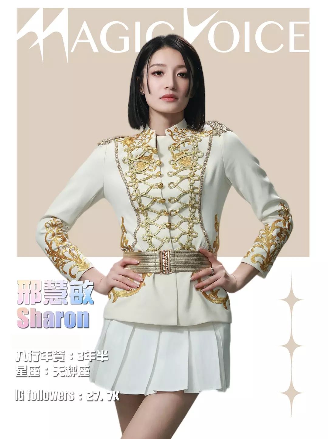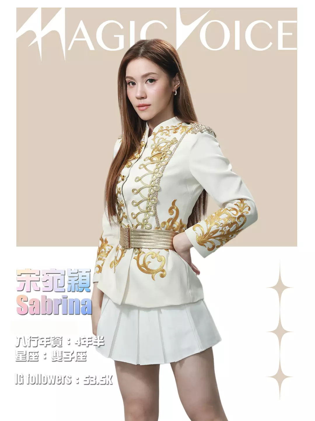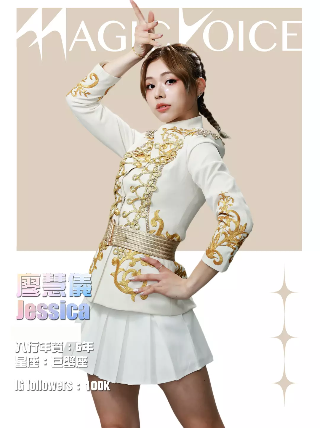 為了預熱,tvb.com昨晚(4月23日)及今早(4月24日)先後發布了16位練習生穿著白底金刺繡女團服、大晒長腿及纖腰的全新個人資料相,除了中、英文名字,還有各人入行年資、星座及IG Followers人數。16人之中,IG擁有最多Followers的頭3位練習生順序為倪嘉雯、廖慧儀及莊子璇。造型方面,除了倪嘉雯的金髮、葉靖儀及俞可程的紅髮夠搶鏡,唯一有戴后冠的莊子璇更是搶中之搶。