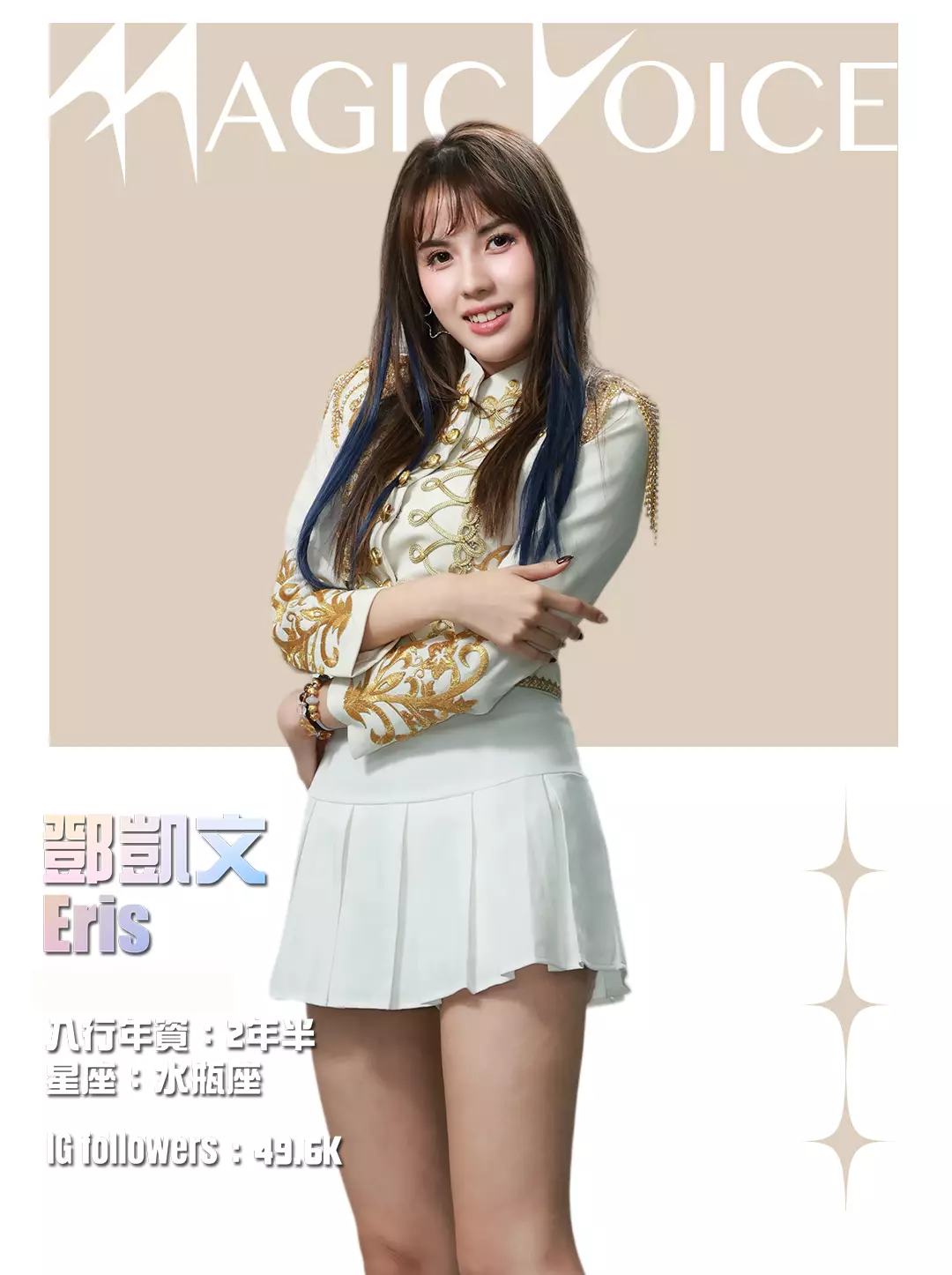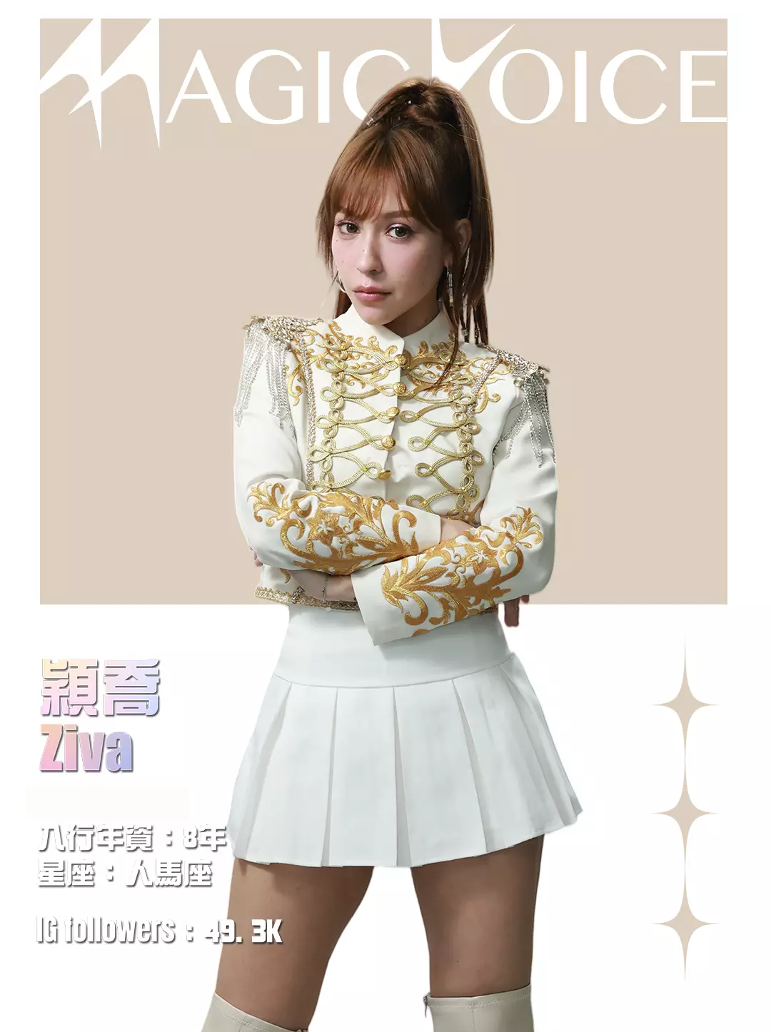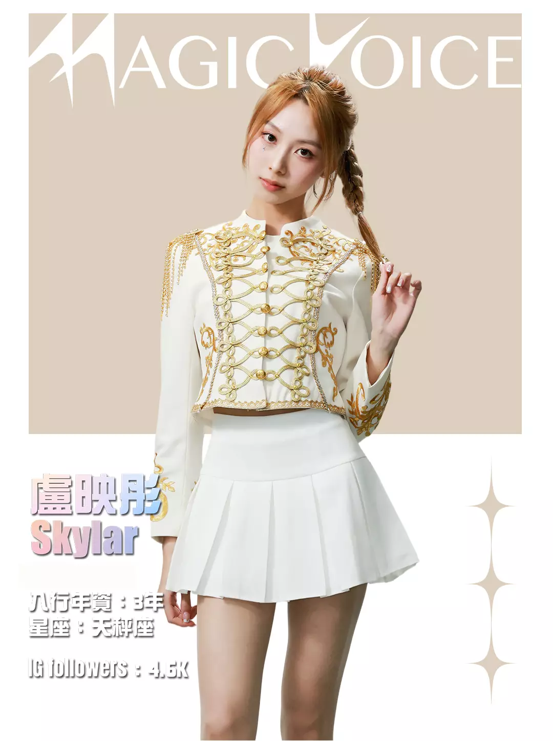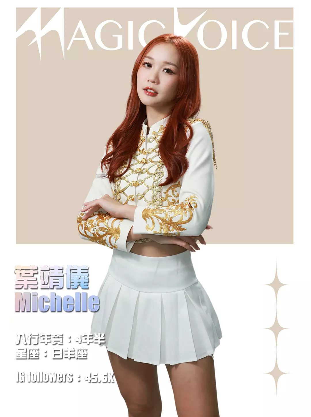 為了預熱,tvb.com昨晚(4月23日)及今早(4月24日)先後發布了16位練習生穿著白底金刺繡女團服、大晒長腿及纖腰的全新個人資料相,除了中、英文名字,還有各人入行年資、星座及IG Followers人數。16人之中,IG擁有最多Followers的頭3位練習生順序為倪嘉雯、廖慧儀及莊子璇。造型方面,除了倪嘉雯的金髮、葉靖儀及俞可程的紅髮夠搶鏡,唯一有戴后冠的莊子璇更是搶中之搶。