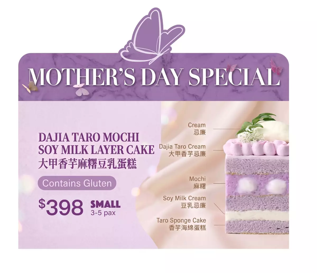 - 限定蛋糕:「果香荔枝紅茶蛋糕」及「大甲香芋麻糬豆乳蛋糕」,面綴食用紫羅蘭寓意守護與誓言。
