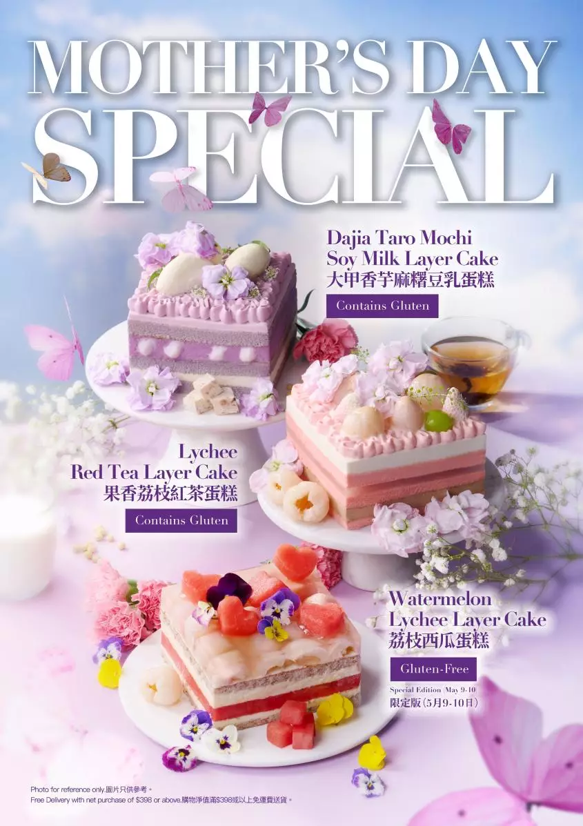 - 早鳥優惠:即日起至5月8日預訂指定蛋糕享85折,最後取貨日為5月16日。