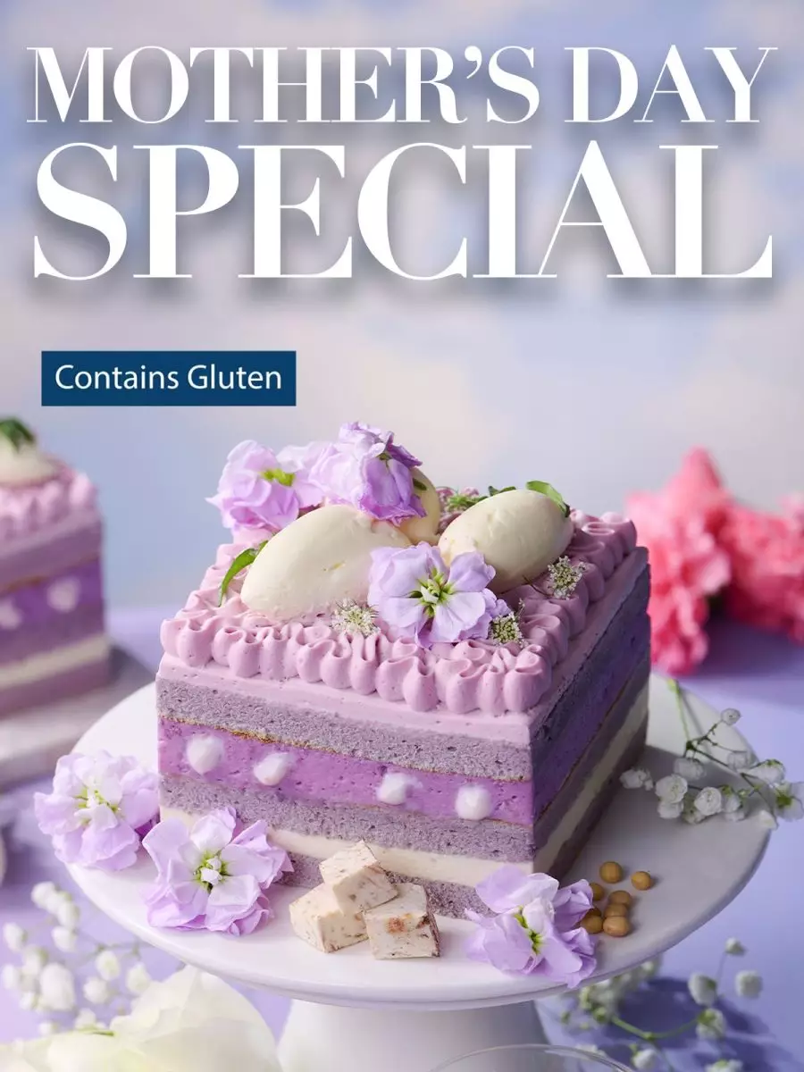 兩款蛋糕的面層均點綴著紫色與粉色的食用紫羅蘭,不僅是視覺點綴,更承載深意:紫色象徵「守護之愛」,寓意子女長大後成為守護母親的依靠;粉色則代表「誓言」與「希望」,寓意對母親多年深情厚愛的永恆感謝。
