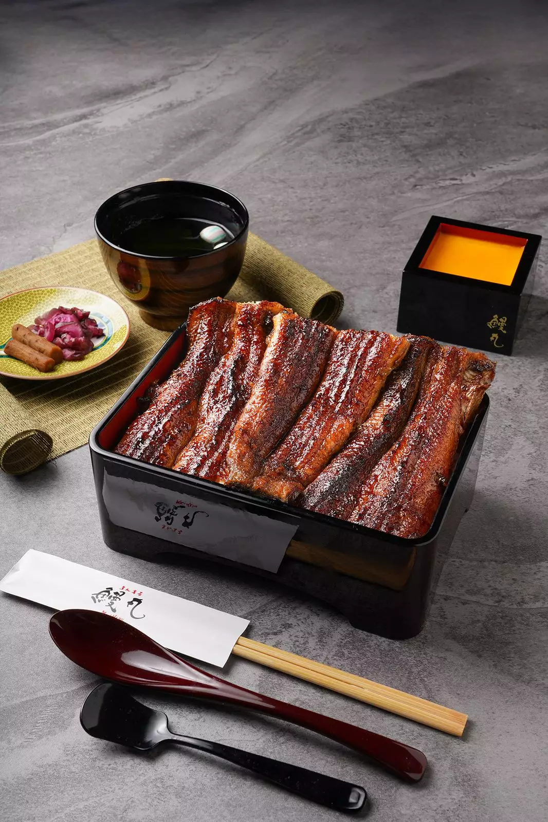 嚴選新鮮活鰻,用井水處理後以備長炭高温炭烤,逼出天然油脂。套餐包括白燒鰻魚一條、間蒸鰻魚飯(鰻魚半條)、特製清湯、漬物及豆乳布丁。