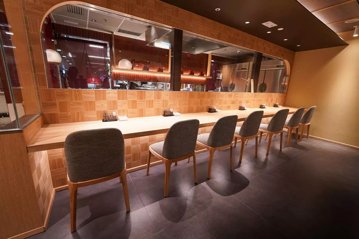 店名「鰻丸」中的「丸」意指圓形,象徵圓滿與連結。空間設計以温潤木系色調為主,配合圓窗設計與柔和燈光,營造沉浸而專注的用餐氛圍。吧枱座位設計讓客人可近距離欣賞炭火燒製過程,體現對料理細節的尊重。