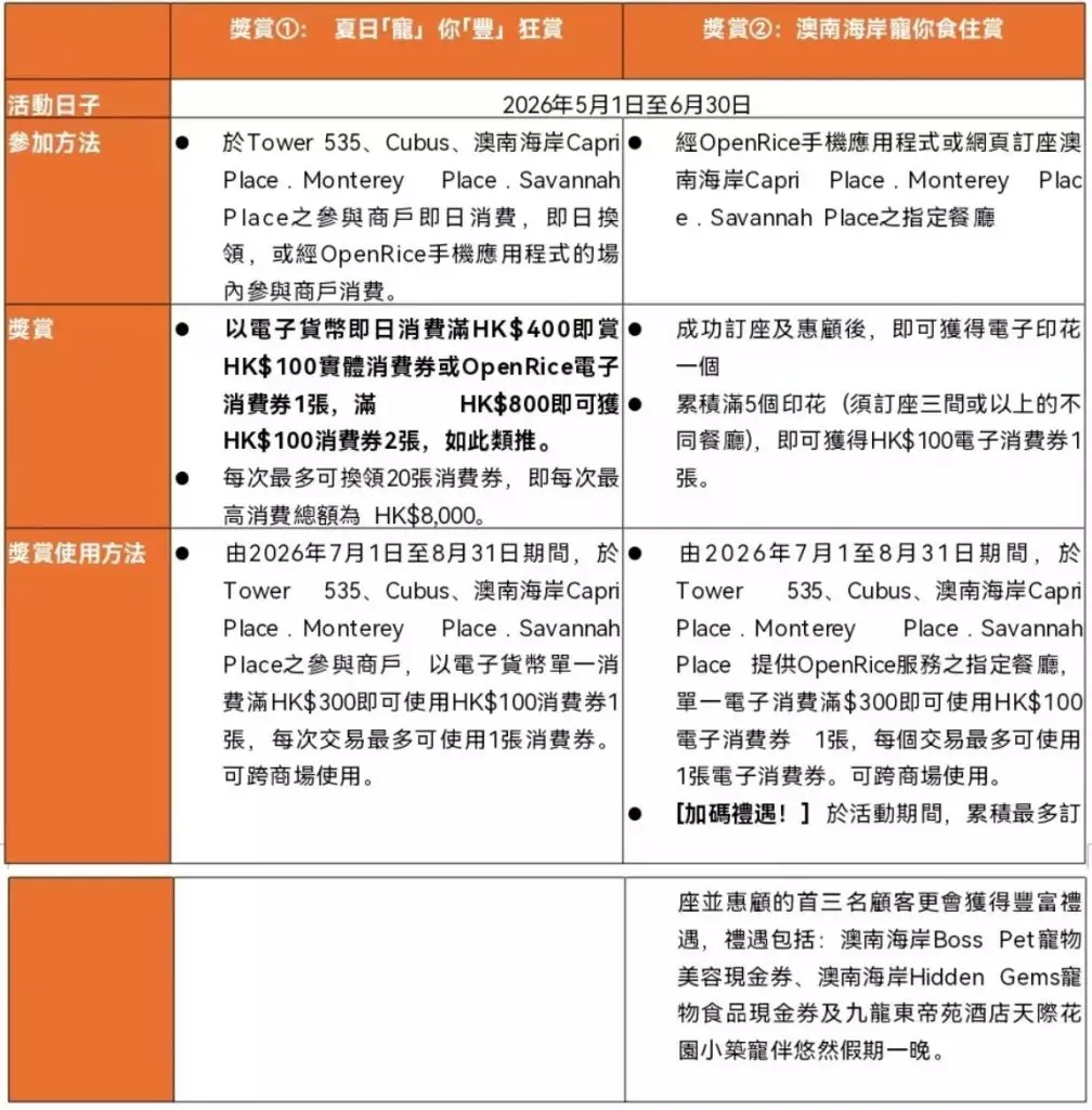 由2026年5月1日至6月30日,「豐泰地產投資」將聯同OpenRice推出兩大消費賞。獎賞 ①「夏日『寵』你『豐』狂賞」,顧客於「豐泰地產投資」旗下之Tower 535、Cubus及澳南海岸Capri Place. Monterey Place.Savannah Place以電子貨幣即日消費滿HK$400,即可免費換領HK$100實體消費券或電子消費券1張,滿 HK$800即可獲HK$100消費券2張,如此類推,越多消費,越多獎賞;獎賞② 「澳南海岸寵你食住賞」,經OpenRice訂座並惠顧澳南海岸旗下三大商場Capri Place.Monterey Place.Savannah Place之指定餐廳,即可獲得電子印花1個。累積滿五個印花,可額外獲得HK$100電子消費券1張。無論是想在新式點心店和家人及毛孩共聚,還是隨心地在餐廳Chill住度過下午,都能享受到至抵優惠。活動期間累積最多訂座並惠顧的首三名顧客,更可獲得豐富的額外愛寵禮遇,包括澳南海岸Boss Pet寵物美容現金券、澳南海岸Hidden Gems寵物食品現金券及九龍東帝苑酒店天際花園小築寵伴悠然假期一晚。