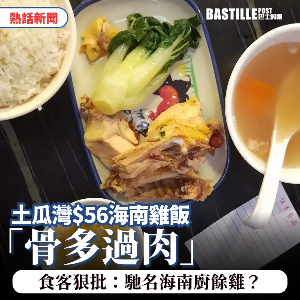 外出食飯最怕「中伏」,有食客近日在土瓜灣一間餐廳,就經歷了一次極度失望的用餐體驗。他點了一份價值56元的海南雞飯套餐,結果上枱的賣相令人咋舌,碟中六件雞肉,竟有四件幾乎全是骨頭,被食客狠批為「最唔掂的海南雞飯」。