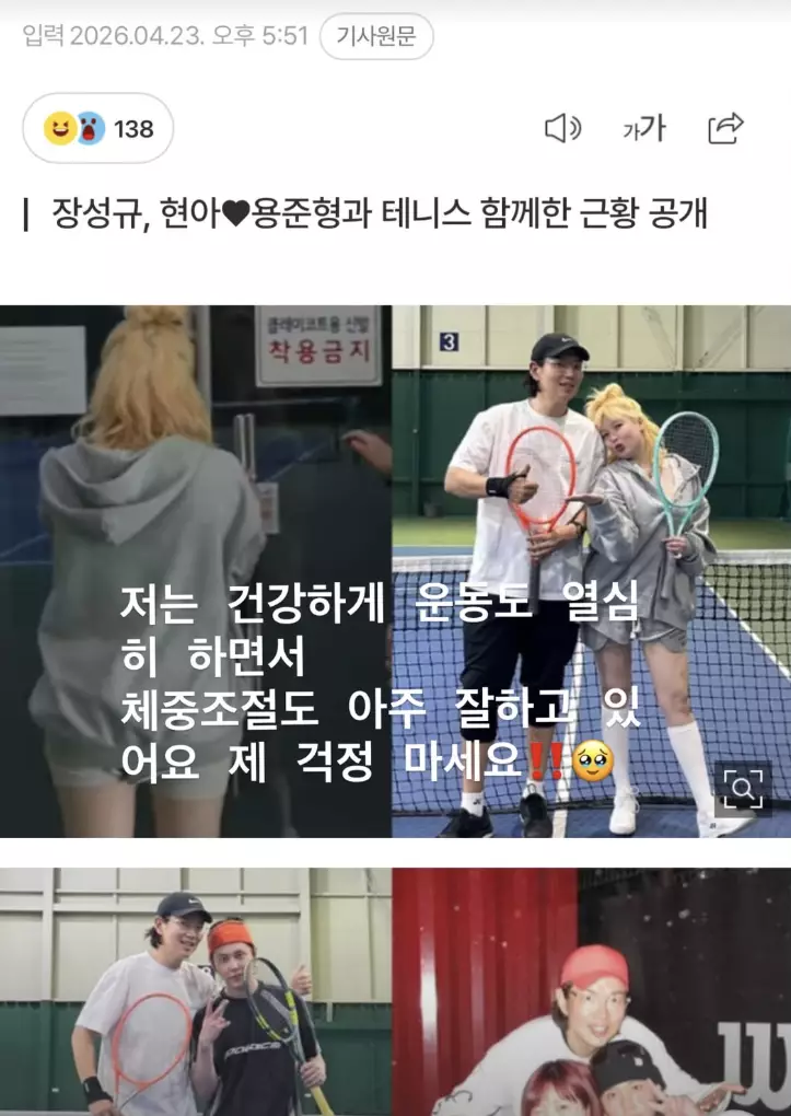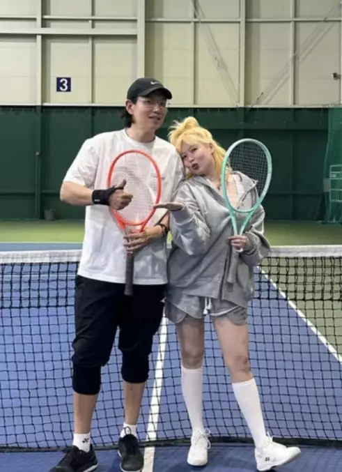 張聖圭在貼文中興奮寫下「網球天才誕生」,並特別點名龍俊亨,直指他即便練習到膝蓋都出現瘀青,依然拼盡全力奮戰的模樣非常帥氣。這次碰面除了切磋球技,更是為了慶祝張聖圭的生日。在公開的影片中,泫雅與龍俊亨以驚喜方式送上蛋糕並合唱生日歌,溫暖的舉動讓張聖圭深受感動。照片裡的三人手持網球拍、臉上掛著燦爛笑容,雖然夫妻倆並未在鏡頭前同框合照,但透過運動共享休閒時光的健康模式,仍讓不少粉絲直呼羨慕。