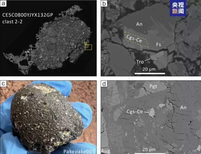 a: 嫦娥五號月壤;c: Pakepake005月球隕石;b,d: 鈰嫦娥石及其共生礦物