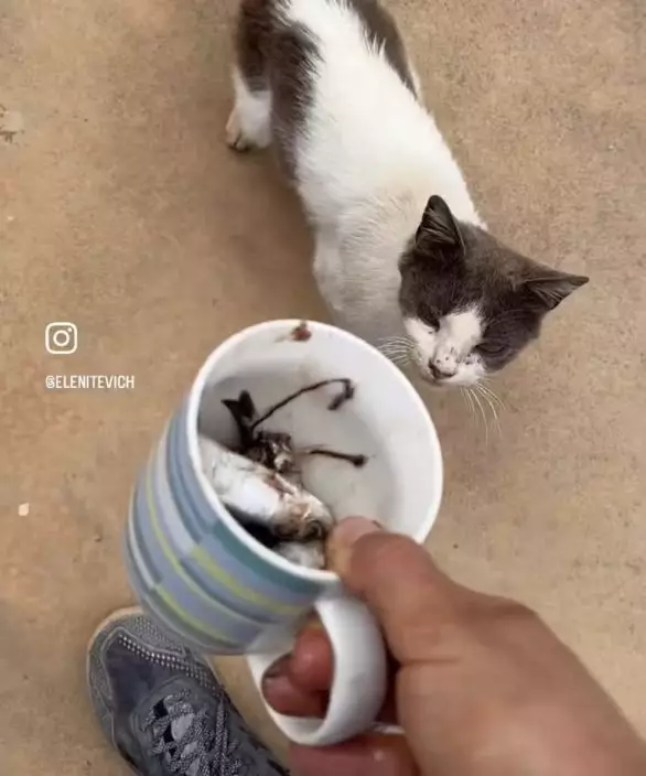 艾琳娜檢查後發現,小貓患有嚴重皮膚問題並出現脫毛情況,疑似長期流浪所致。她坦言,當下未有即時將小貓帶走,但回家後仍念念不忘,翌日特意帶著食物返回現場,最終成功找到小貓並將之送往獸醫檢查。她表示,小貓雖為流浪貓,但性格溫馴親人,即使在獸醫檢查過程中也十分配合,並不時發出呼嚕聲,似乎感受到安全與安心。
