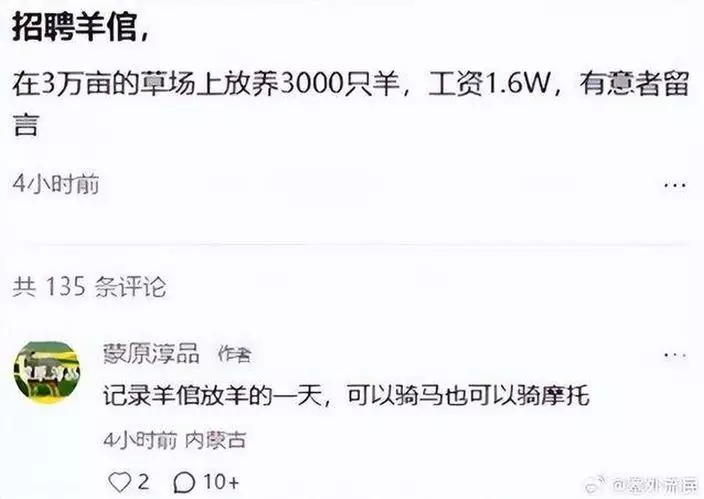 內蒙古錫林浩特一則招聘放羊工的啟事,近日在內地網絡平台引發熱烈討論,甚至登上熱搜榜首。
