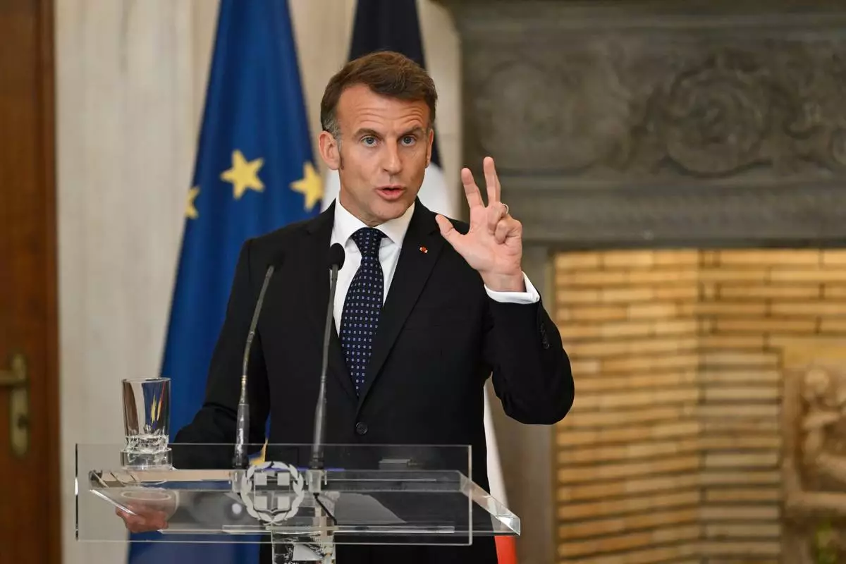 法國總統馬克龍,周六(2026年4月25日)在希臘雅典馬克西莫斯大廈(Maximos Mansion)與希臘總理米佐塔基斯舉行記者會期間發言。(美聯社圖片/Michael Varaklas) AP圖片