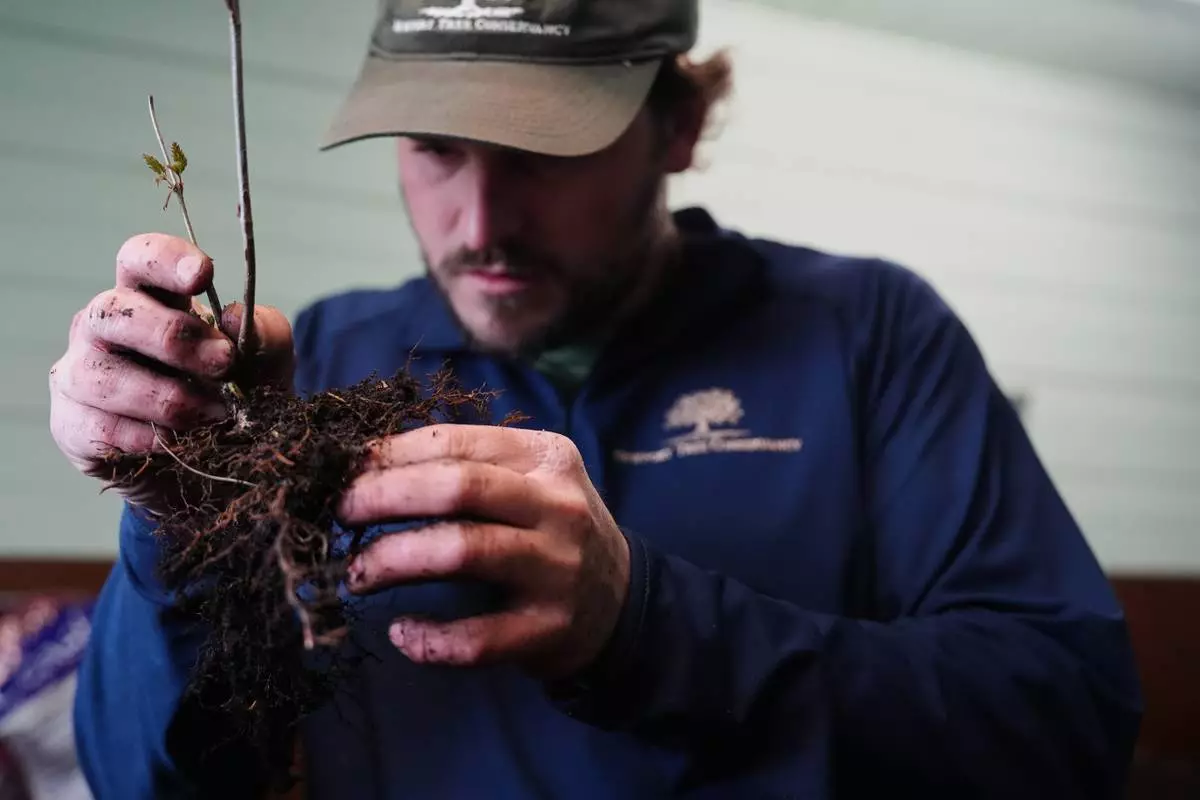 2026年4月22日周三,紐波特樹木保育協會活體植物收藏經理祖維斯坦迪(Joe Verstandig)在羅德島州紐波特清除一棵本土樹苗上多餘的土壤。(美聯社圖片/Joshua A. Bickel) AP圖片