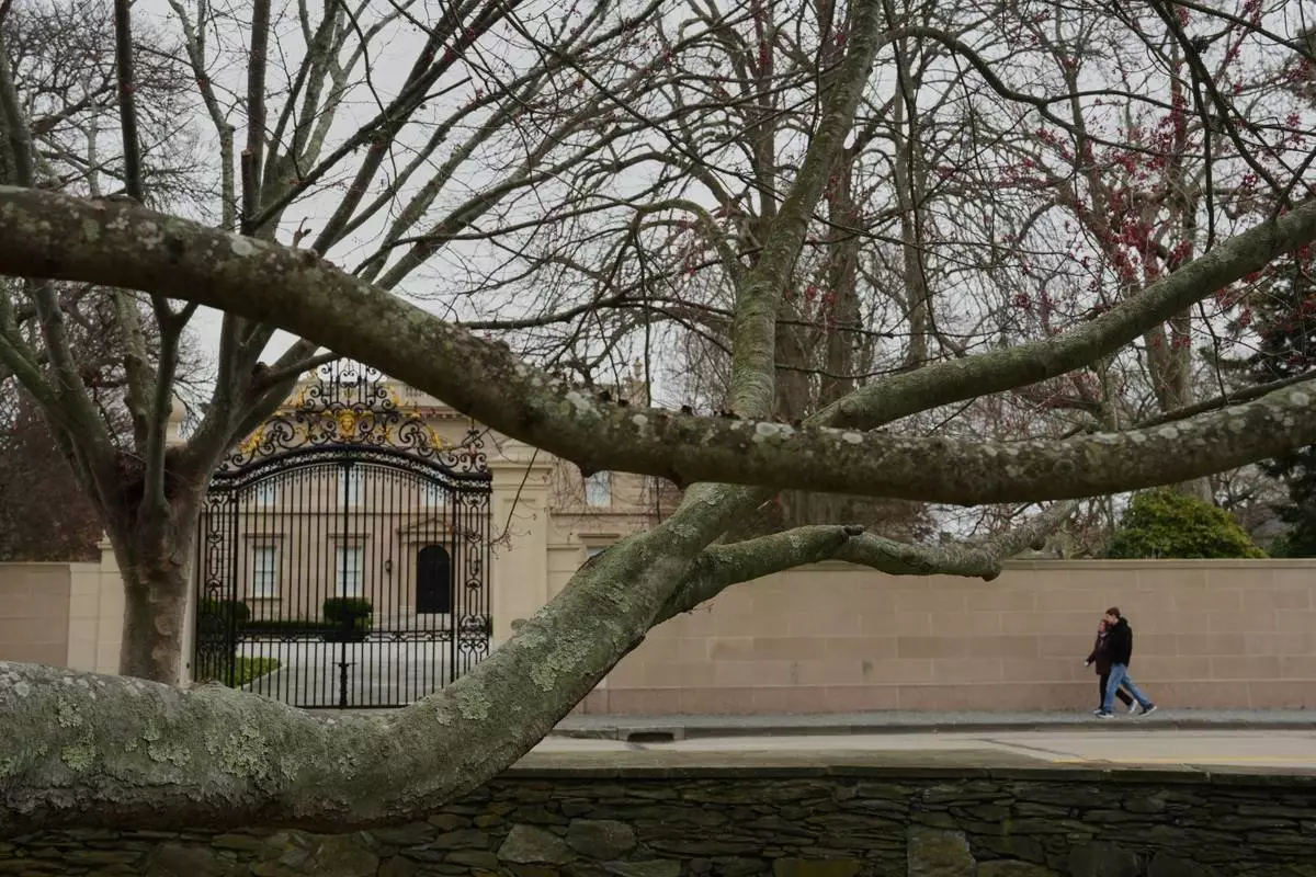 2026年4月22日周三,人們在羅德島州紐波特的一座豪宅和一棵紅楓樹附近行走。(美聯社圖片/Joshua A. Bickel) AP圖片