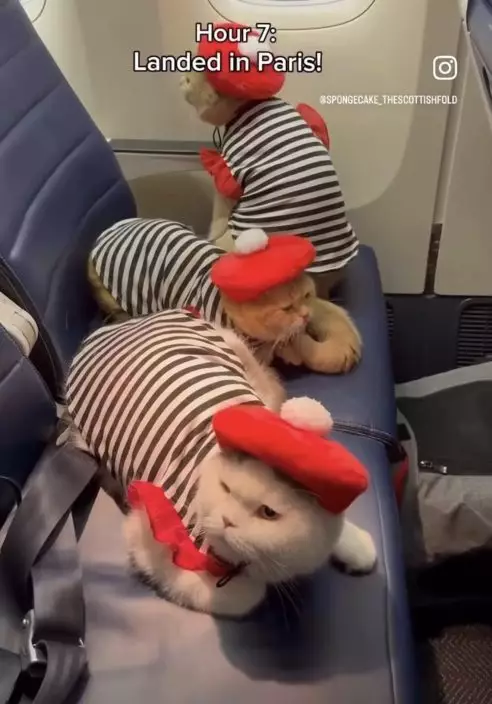 日前,國外一名男飼主「@spongecake_thescottishfold」於Instagram上分享帶著3隻寵物貓Sponge Cake、Donut及Buttercream搭乘飛機前往巴黎的影片,可愛畫面曝光後,令不少「貓奴」直呼被融化。