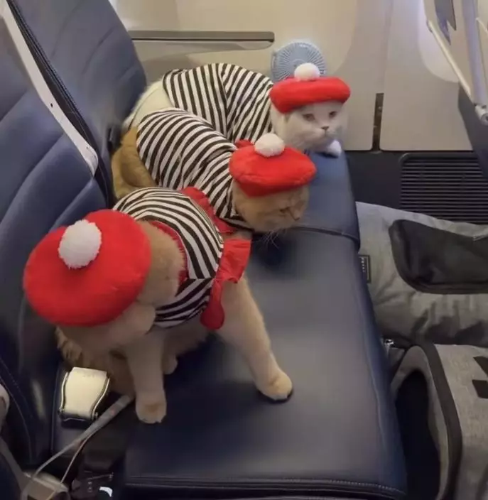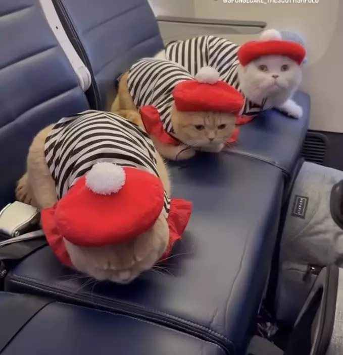 影片可見,飼主抱著3隻小貓通過機場安檢,只見牠們全程表現平靜,未見慌張,似乎早已習慣外出。其中一隻名為Donut的小貓更主動跳入行李箱,畫面既逗趣又吸睛。3隻小貓之後穿上小衣服登機,一現身即吸引機上乘客注意,引來不少人紛紛舉機拍照或上前觀賞,整個機艙氣氛瞬間變得熱鬧非凡。