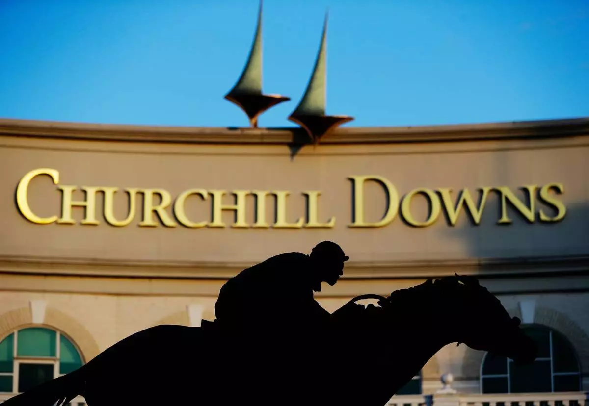 資料圖片:2020年5月6日,肯塔基州路易斯維爾丘吉爾園馬場(Churchill Downs)入口處,馬匹「巴巴羅」(Barbaro)的雕像剪影。(美聯社圖片/達倫·卡明斯 Darron Cummings) AP圖片