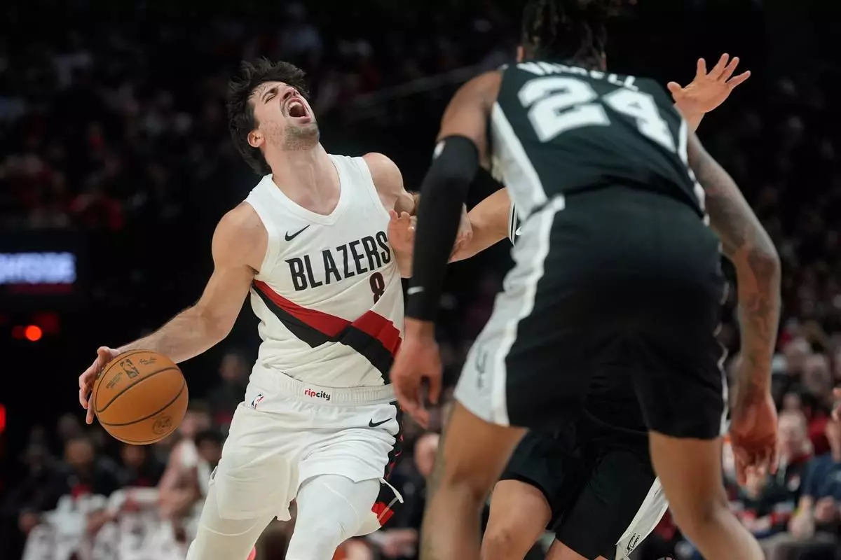 2026年4月24日周五,在俄勒岡州波特蘭舉行的NBA季後賽首圈第三場比賽下半場,波特蘭拓荒者前鋒丹尼艾夫迪亞(8號)在進攻時被聖安東尼奧馬刺球員犯規。(美聯社圖片/珍妮簡恩) AP圖片