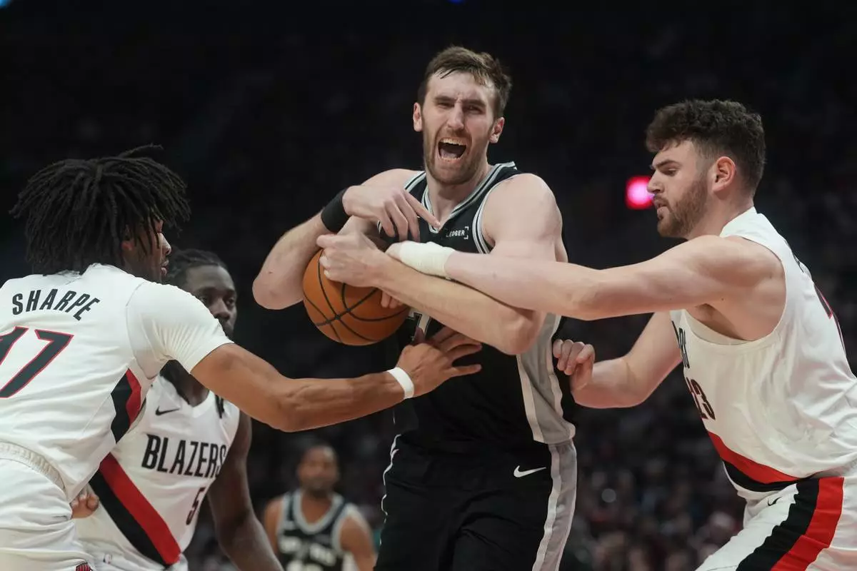 2026年4月24日周五,在俄勒岡州波特蘭舉行的NBA季後賽首圈第三場比賽下半場,聖安東尼奧馬刺中鋒路克哥尼特(中)與波特蘭拓荒者中鋒多諾雲克林根(右)爭奪籃球控制權。(美聯社圖片/珍妮簡恩) AP圖片