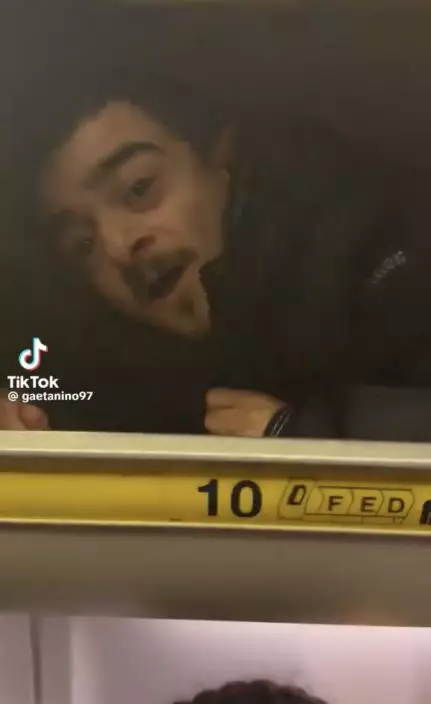 影片可見,男子蜷縮於機艙頭頂狹窄的行李架內並對鏡頭高喊意大利語「Napoli」,還配上字幕稱「如何不花錢買回程票?但我被抓到了……」。據悉,該男子還疑因錯過航班在機場大廳情緒失控,不僅大聲咆哮,更推倒排隊護欄,行為失當引來旁人側目。