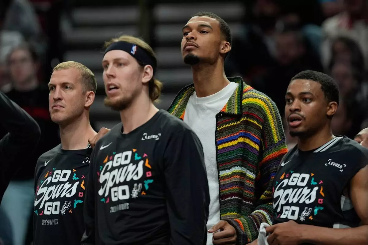 2026年4月24日,周五,聖安東尼奧馬刺(San Antonio Spurs)前鋒維克托·文班亞馬(Victor Wembanyama)身穿便服,坐在後備席上,缺席在俄勒岡州波特蘭舉行的對波特蘭拓荒者(Portland Trail Blazers)的首圈NBA季後賽第三場賽事。(美聯社圖片/Jenny Kane) AP圖片