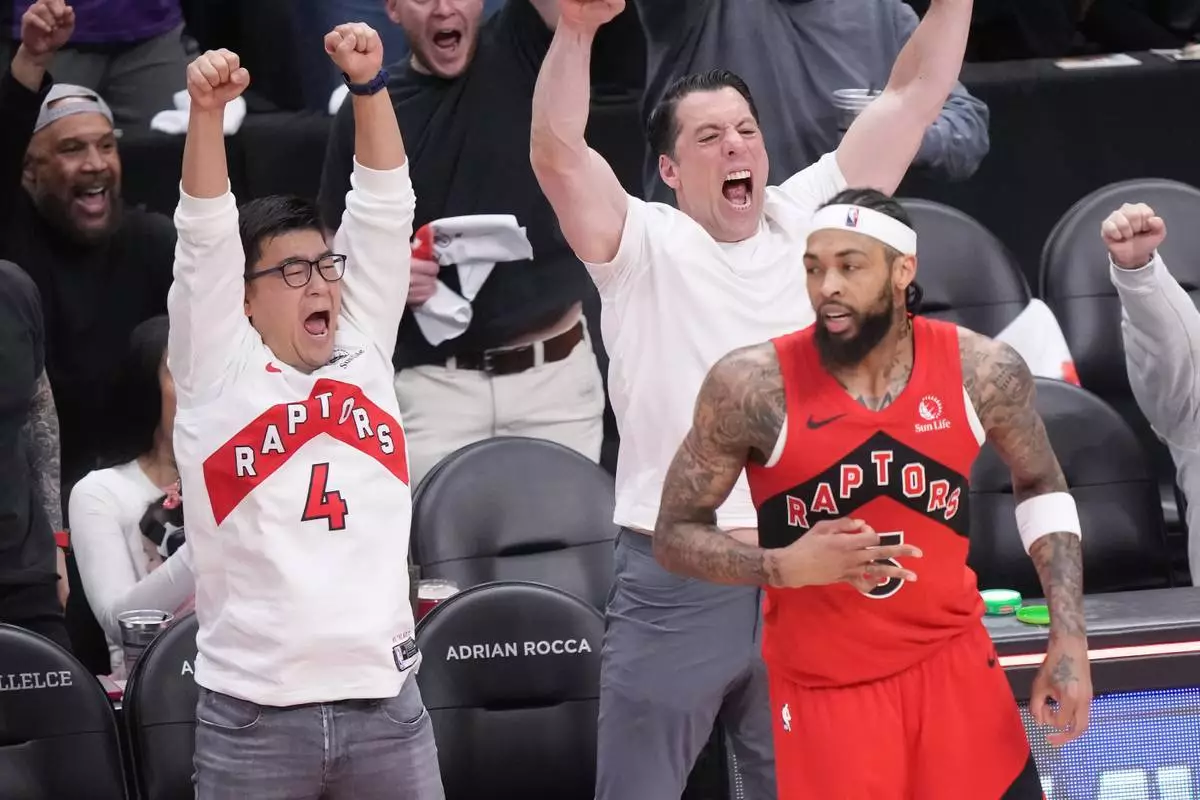 2026年4月26日周日,NBA季後賽首圈第四場賽事於多倫多舉行,多倫多速龍前鋒班頓英格倫(前)在上半場最後幾分鐘射入三分球後,球迷們的反應。(美聯社圖片/Nathan Denette/The Canadian Press) AP圖片