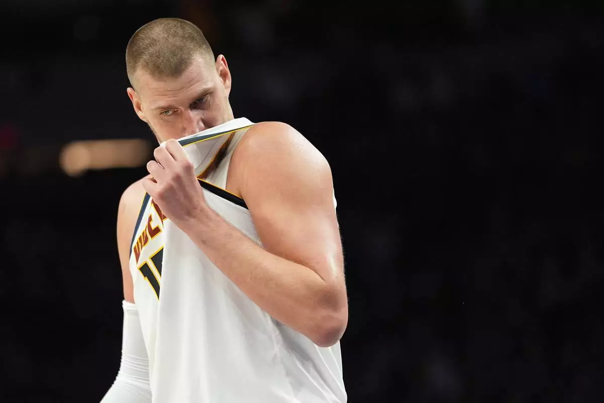 丹佛金塊隊中鋒約基奇(15號)在2026年4月23日(周四)於明尼亞波利斯舉行的NBA季後賽首圈第三場對陣明尼蘇達木狼隊的比賽下半場,等待比賽恢復。(美聯社圖片/Abbie Parr) AP圖片