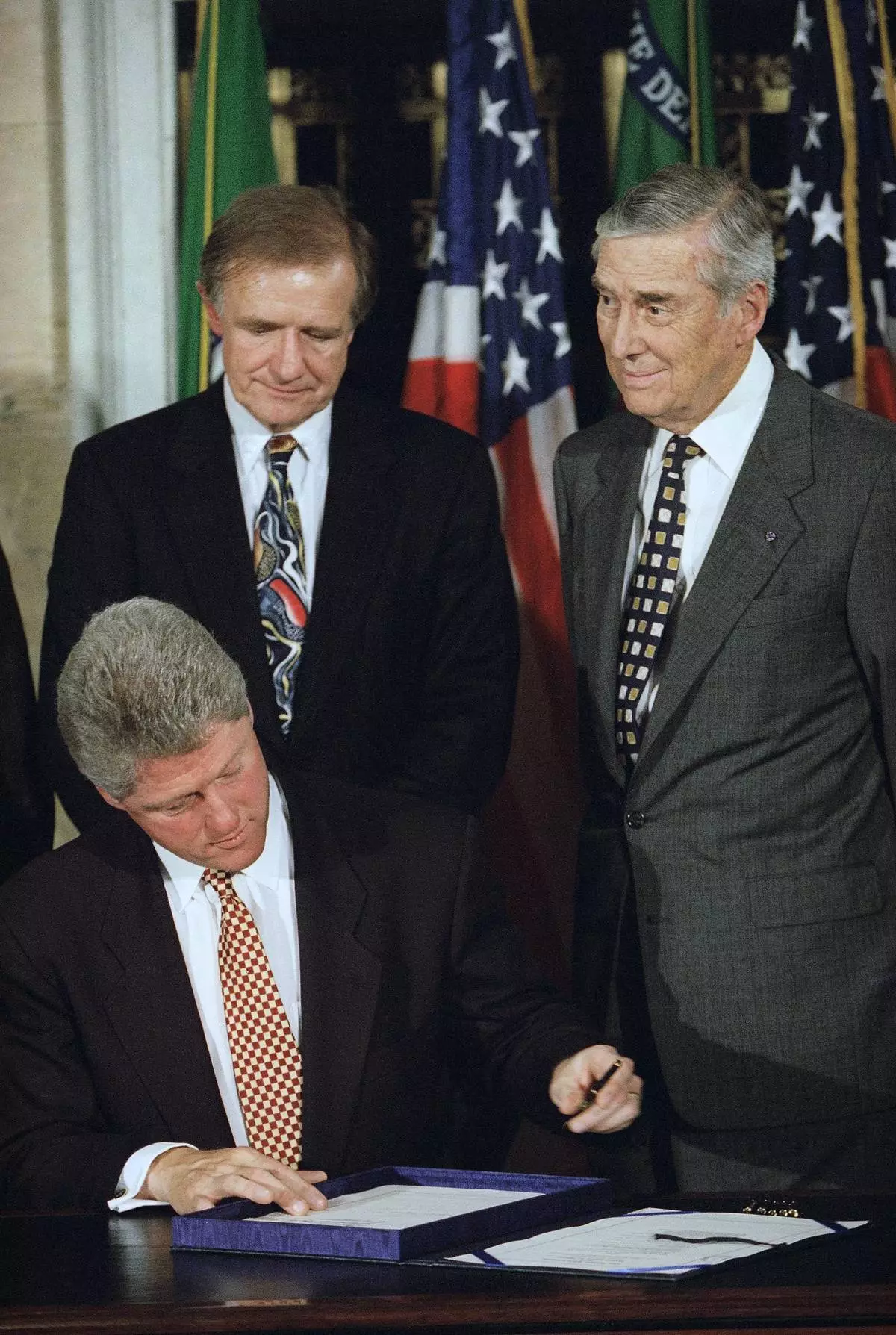 (美聯社圖片/Doug Mills, File) 1994年9月29日,美國總統克林頓(Bill Clinton)在華盛頓財政部現金室簽署1994年州際銀行及分行效率法案,密歇根州民主黨參議員唐納德·里格爾(左)及財政部長勞埃德·本特森(Lloyd Bentsen)在旁觀看。 AP圖片