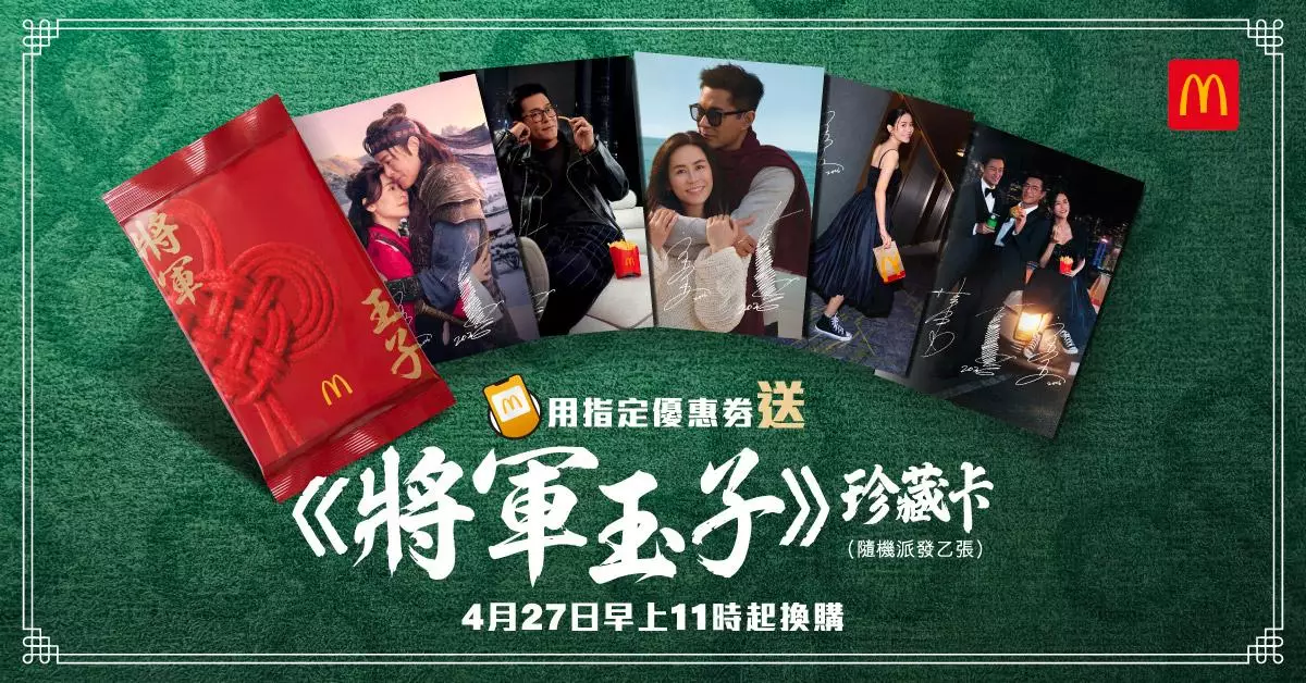 麥當勞年度盛事「將軍漢堡系列」星期一(4月27日)正式浪漫回歸,今年更帶來驚喜大彩蛋,強勢聯乘香港演藝圈最經典的「螢幕情侶」古天樂(Louis Koo)及宣萱(Jessica Hsuan),為美食注入跨越時空的愛情故事。除了玉子將軍漢堡、將軍漢堡及玉子雙層將軍漢堡三款經典滋味載譽歸來,更同步推出多款全新期間限定美食,包括日式甜咖哩雞翼、抹茶麻糬三角批等,讓粉絲味蕾與情懷同時大滿足。