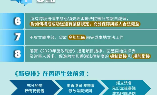 林定國又指,《新安排》不會立即生效,會充分諮詢所有相關持份者意見,經立法會進行「先訂立後審議」程序,再對相關的法院規則作出修訂後才生效。律政司正連同司法機構和最高人民法院密鑼緊鼓地進行各項準備工作,目標在今年第四季,將相關修訂刊憲和提交立法會,爭取在今年內落實新機制。