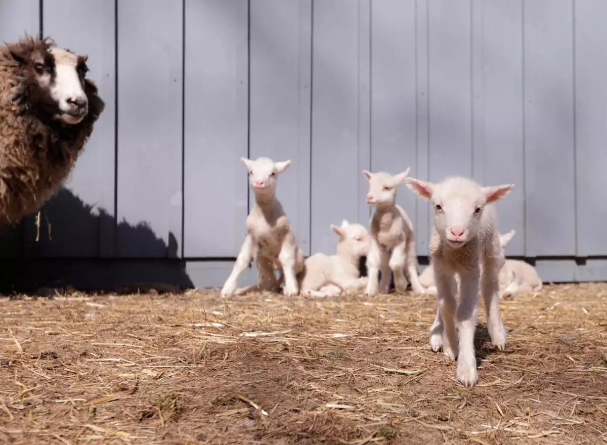 2026年4月23日周四,佛蒙特州安德希爾「三葉草與蜜蜂農場」(Clover & Bee Farm),一隻羊媽媽與牠的六胞胎小羊。(美聯社圖片/Amanda Swinhart) AP圖片