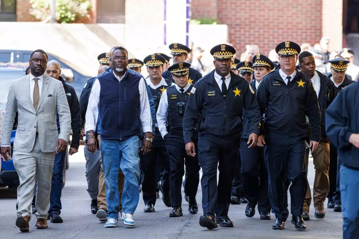 2026年4月25日(周六),芝加哥湖景區伊利諾伊共濟會醫院高級護理中心(Illinois Masonic Hospital Advance Care)外,市長布蘭登約翰遜(Brandon Johnson)與芝加哥總警司拉里史奈林(Larry Snelling)及其他官員,在槍擊案後向媒體發表講話。(美聯社圖片/Anthony Vazquez/Chicago Sun-Times) AP圖片