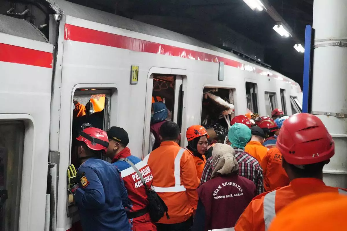 救援人員在印尼勿加泗一個車站的列車相撞事故後搜尋受害者。攝於2026年4月27日周一。(美聯社圖片/Achmad Ibrahim) AP圖片