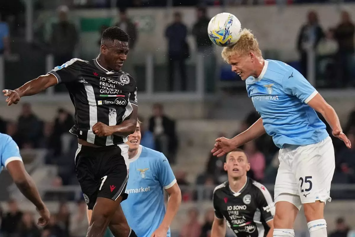 烏甸尼斯球員伊迪沙古爾(Idrissa Gueye)(左)與拉素球員普羅夫斯加特(Oliver Provstgaard)在意大利羅馬舉行的意甲足球賽中對壘,攝於2026年4月27日周一。(美聯社圖片/Alfredo Falcone/LaPresse) AP圖片