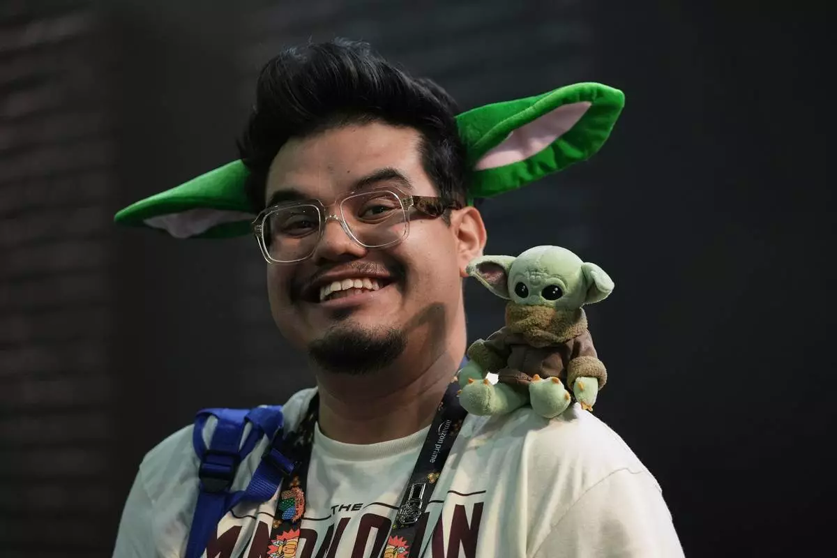 一名男子於2026年4月26日周日,在墨西哥城CCXP墨西哥展上肩上扛著古古毛絨玩具。(美聯社圖片/Ginnette Riquelme) AP圖片